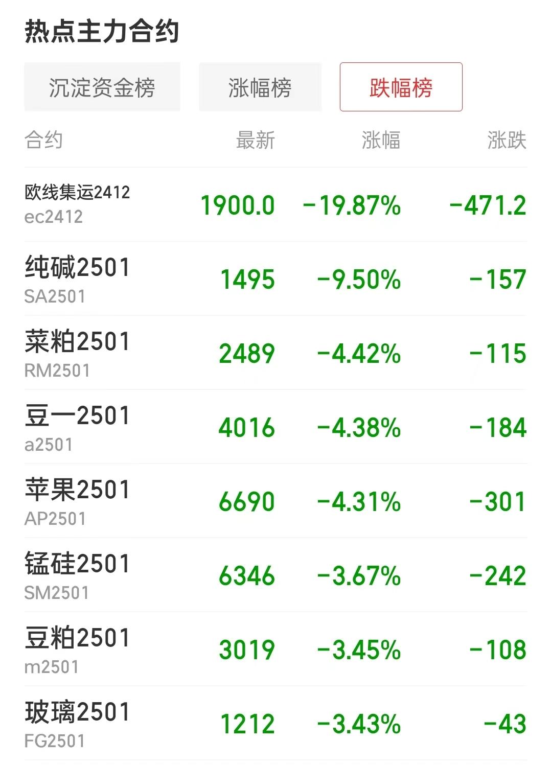 跌幅方面,集运指数(欧线)跌超19%,纯碱跌超9%,菜粕、豆一、苹果跌超4%。