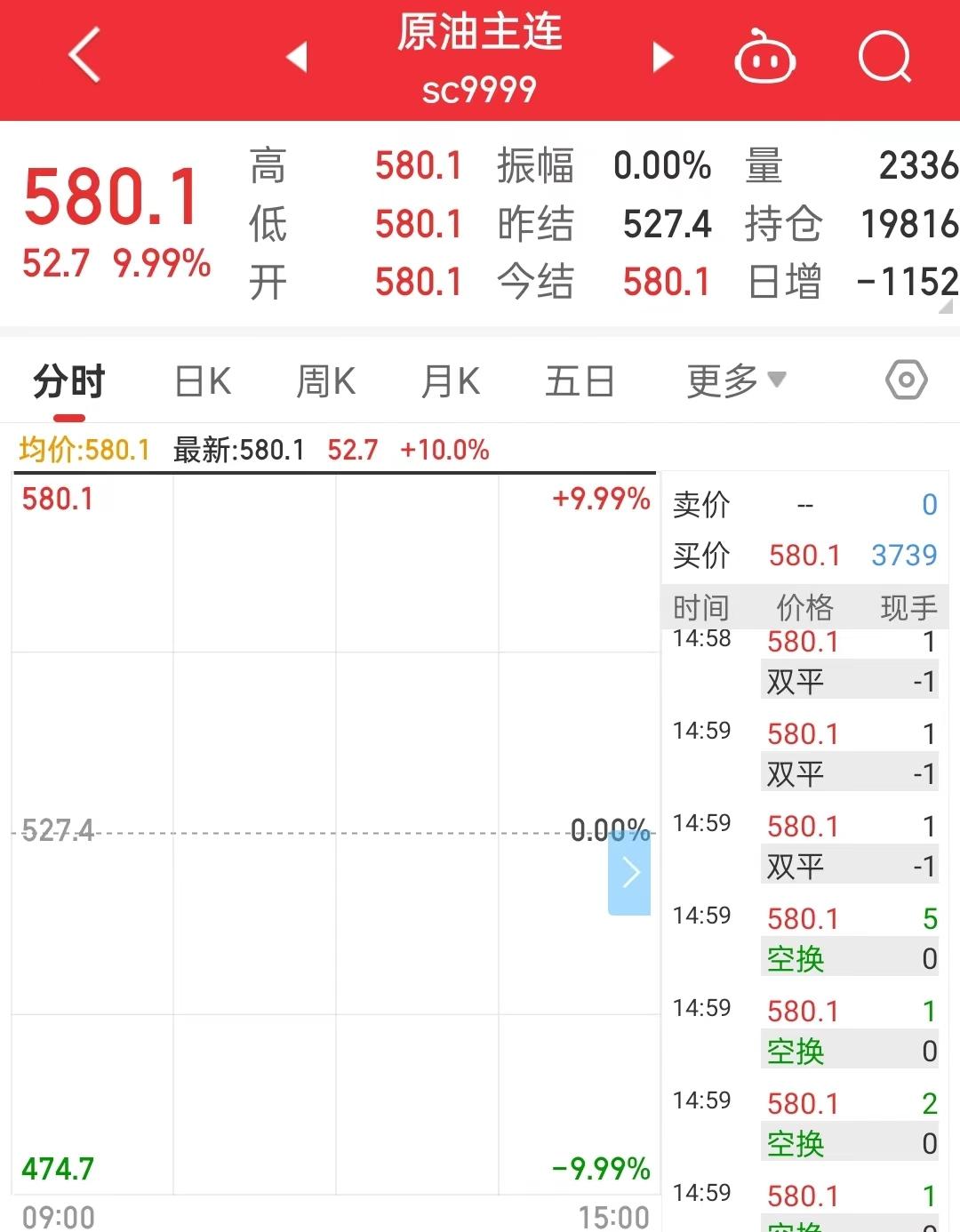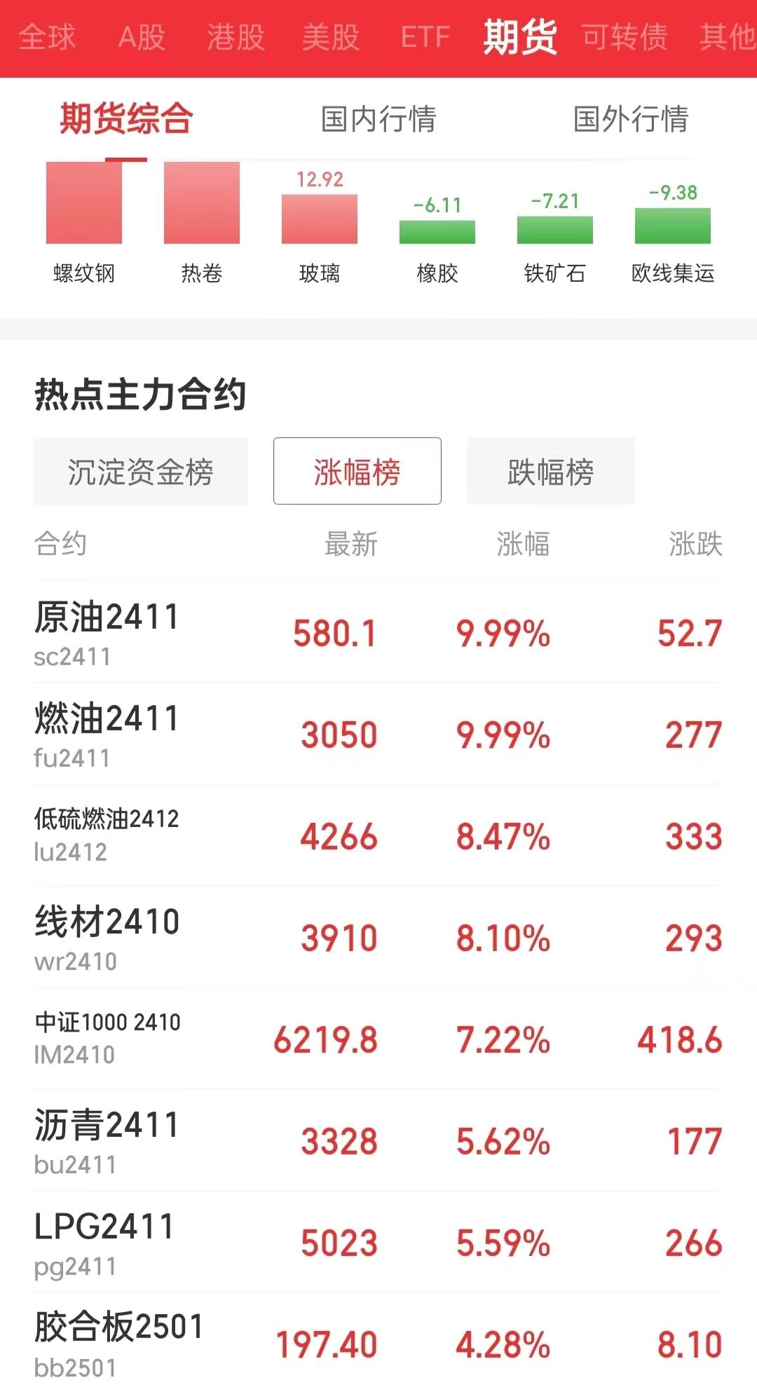 截至10月8日日间收盘,国内期货主力合约收盘涨跌互现,原油、燃油封涨停板,涨幅均为9.99%;低硫燃料油涨超8%;中证1000股指期货涨超7%;沥青、液化石油气(LPG)涨超5%。