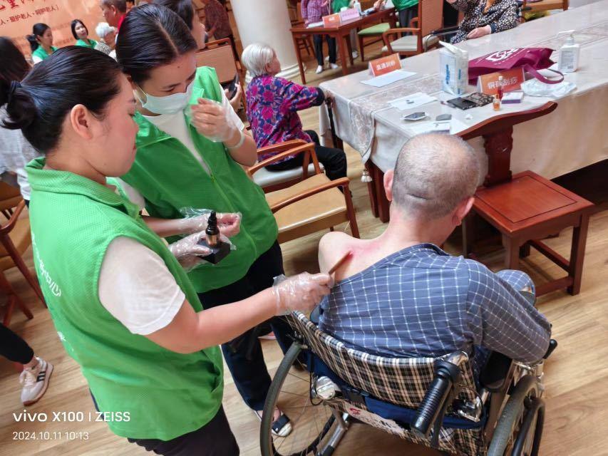 在中医适宜技术体检区,老人们有序体验铜砭刮痧、火龙罐、温通刮痧、耳穴、艾灸等中医适宜技术。