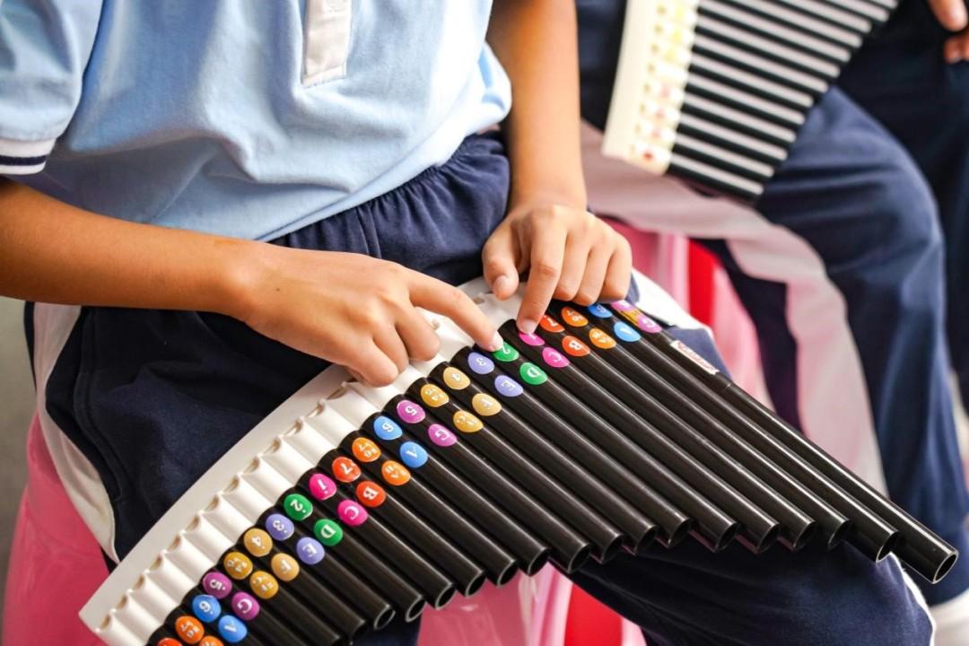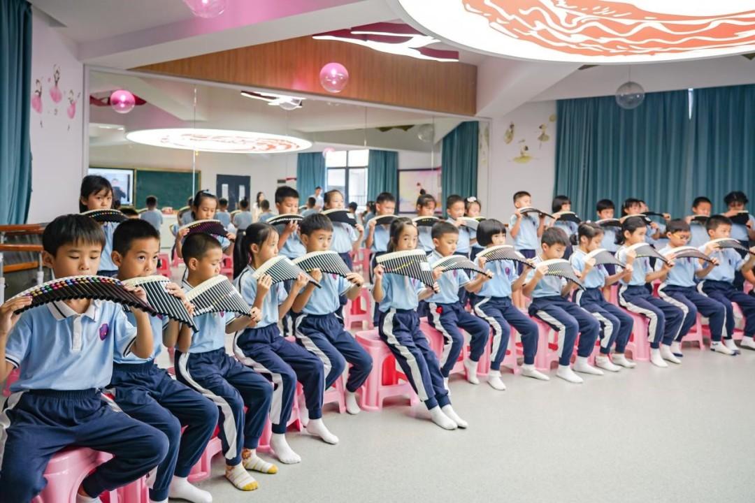 2024年4月中旬开始,学校在原有的中年段器乐教学的良好基础上,面向低年级开展器乐进课堂课程。一年级的器乐进课堂教学主要进行了排箫的教学,在教学过程中创新性地使用了双师课堂模式,引进AI数字化学练工具,既确保学生在校得到专业指导,更能帮助学生解决在家练习与辅导的问题。在9月30日的一节器乐课堂上,刚刚升上二年级的同学们正在学习吹奏《多年以前》。他们先观看了屏幕上AI老师对于吹奏技巧的讲解和示范,然后在李婉奕老师的指导下,跟着音乐进行吹奏练习,屏幕会提醒孩子们该吹奏哪一个音符了,李老师则巡视着课堂,指导孩子的吹奏。