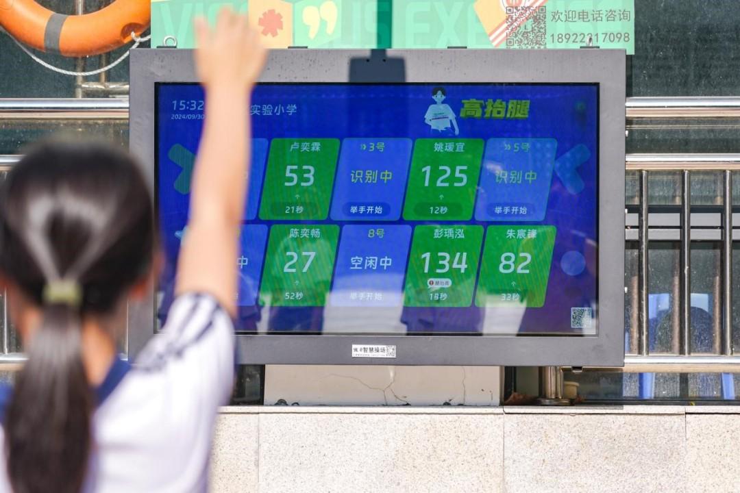 在操场的另一边,同学们站在相应点位上,练习着跳绳和高抬腿,系统同样会记录他们的运动情况。五年四班的孟禹羲经常在放学后到操场练习立定跳远。“系统会记录我的跳远姿势,我还能看回放,发现自己起跳时手臂摆动幅度不够大,纠正并且加强练习之后,我从原来只能跳一米左右,现在能跳到一米五左右了。”