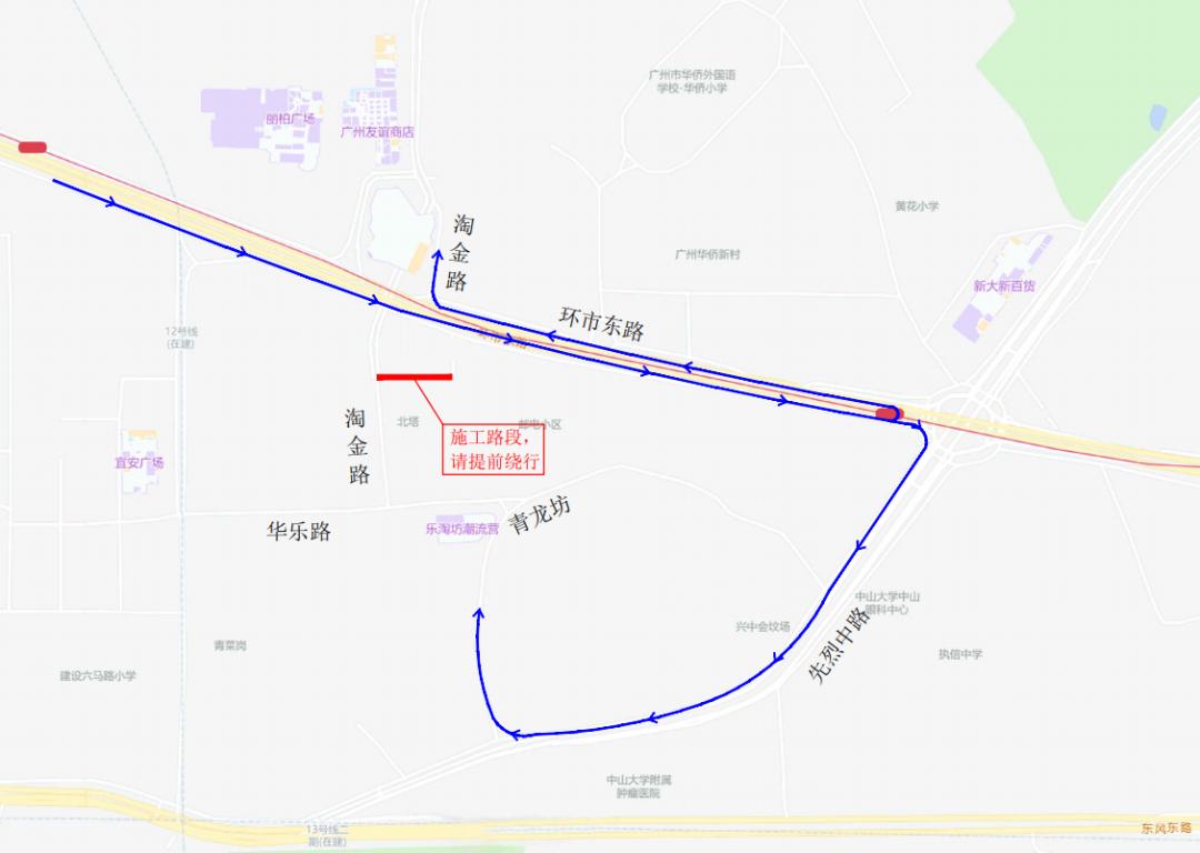 施工期间,途经淘金北路,可通过环市东路→区庄立交桥→环市东路→淘金路该路线进行绕行;途经淘金路、华乐路,可通过环市东路→先烈中路→先烈南路→青龙坊→华乐路该路线进行绕行。