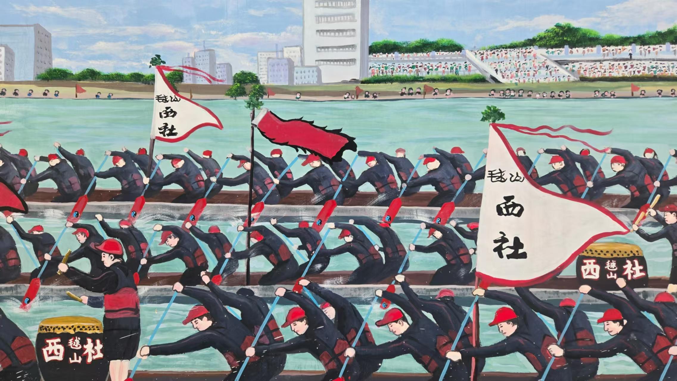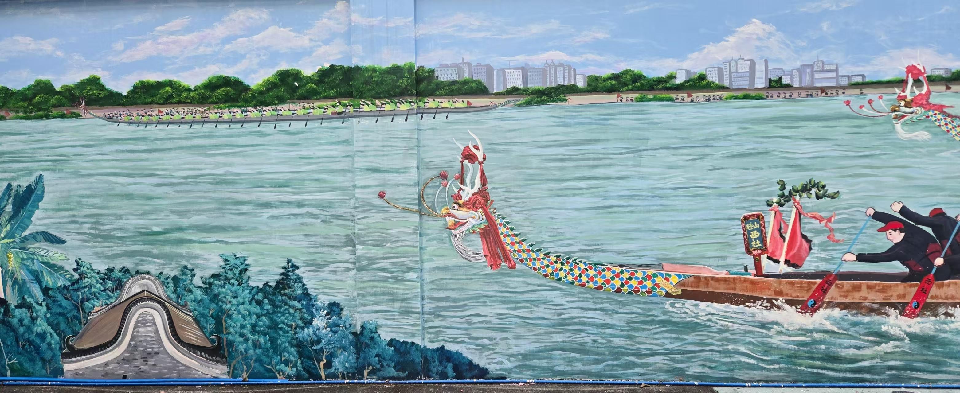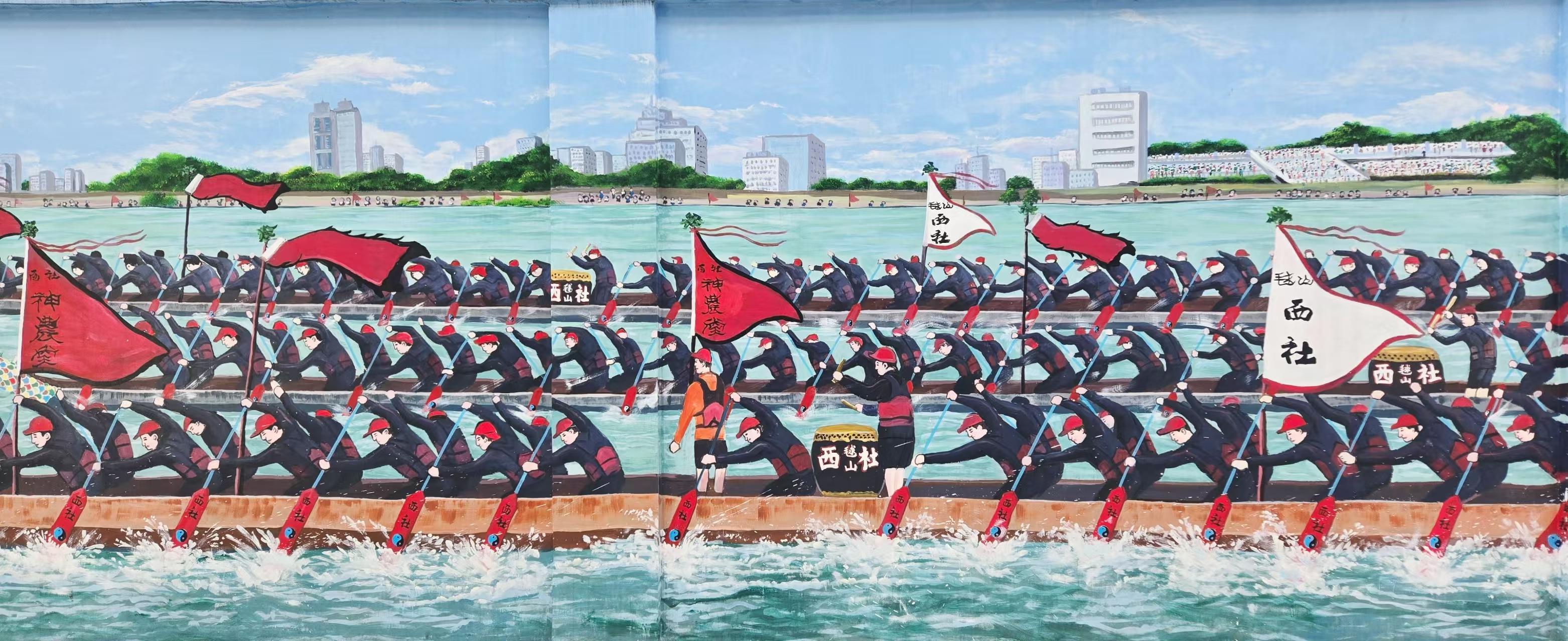 石岗西村村干部介绍,这个墙绘项目在实施前,广泛征询了群众的意见和需求,邀请了专业设计师进行墙绘设计方案的规划,确保墙绘内容符合石岗西村的整体风格和文化内涵,因此将“石岗景”的场景搬到墙上,让村民传承和弘扬传统龙舟精神。