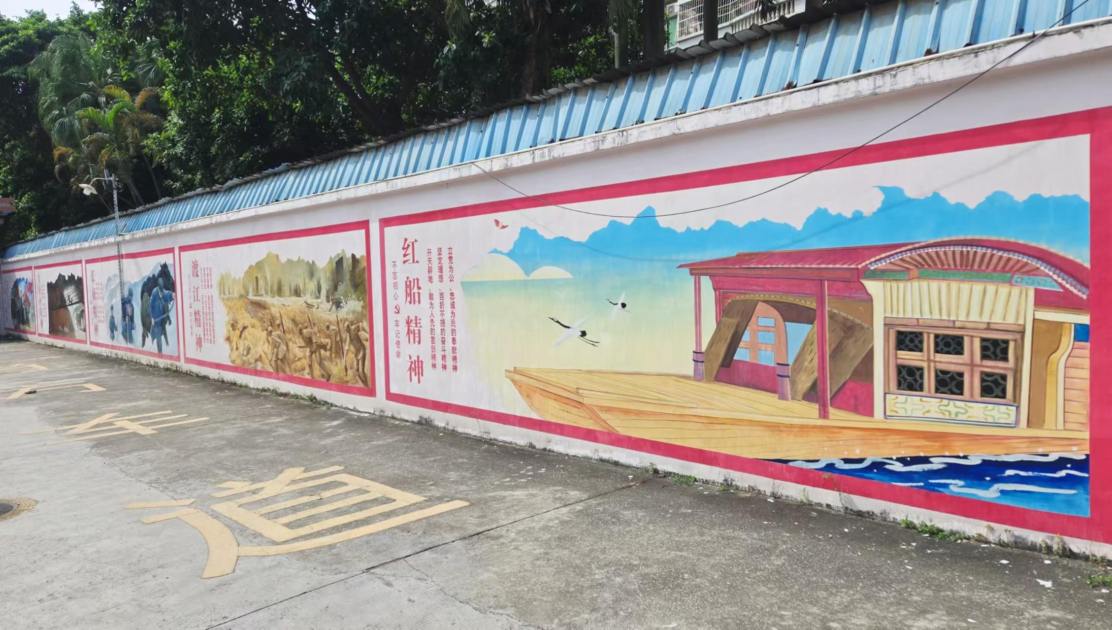 据了解,石岗西村酒堂及停车场围墙因时间较长,墙体老化,破损较多。为美化农村人居环境,弘扬红色文化,传承传统龙舟精神,增强村民凝聚力和向心力,石岗西村因地制宜,制定石岗西村传统文化和党史文化墙绘项目,并将该项目列为“民生微实事”项目之一,通过创作具有本村特色和文化内涵的墙绘作品,满足了村民对美好生活的向往。