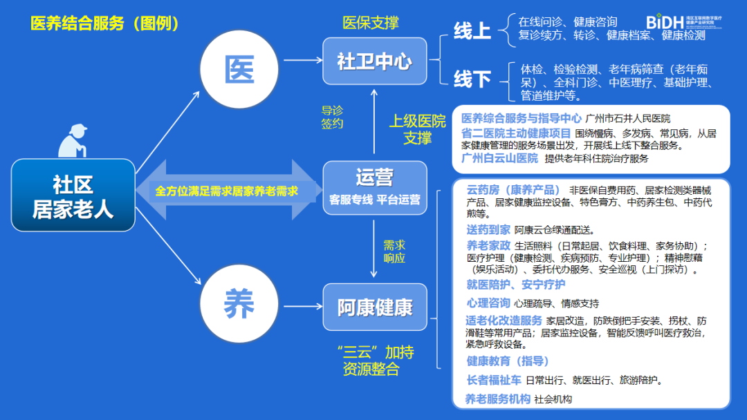 白云区卫健局副局长钟智佳介绍,此次启动“互联网+医养结合”试点,由街道、基层社区卫生服务中心、第三方企业联合组成社区互联网医养结合服务团队,区医养结合服务与指导中心和省、市三甲医院作为技术支撑,整合院内线上线下医疗服务与第三方医药服务、慢病管理服务和家政服务等,在提供线下线上一体化的专业医疗、医药、问诊、购药、护理、康复服务。同时,还能提供更便捷、更贴心、更周全的衣、食、住、行居家养老服务。
