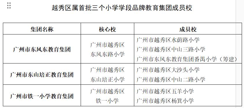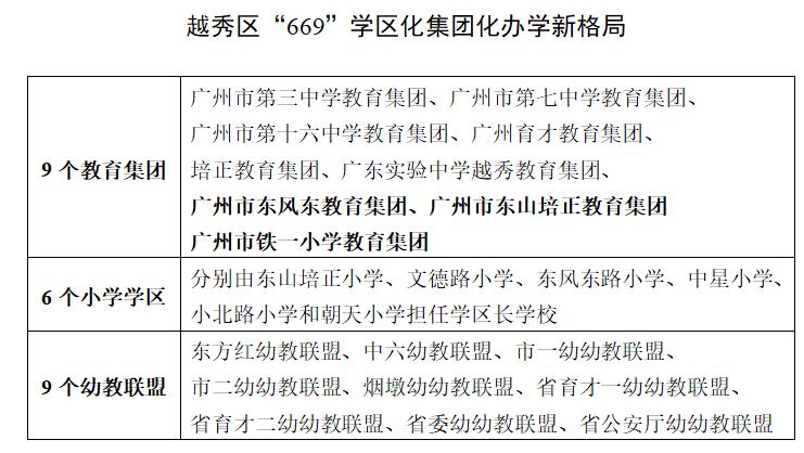 记者了解到,越秀区全力创建全国义务教育优质均衡发展区,升级迭代“669”的学区化集团化办学新格局,适时组建越秀区首批三个小学学段的品牌教育集团——广州市东风东教育集团、广州市东山培正教育集团和广州市铁一小学教育集团。