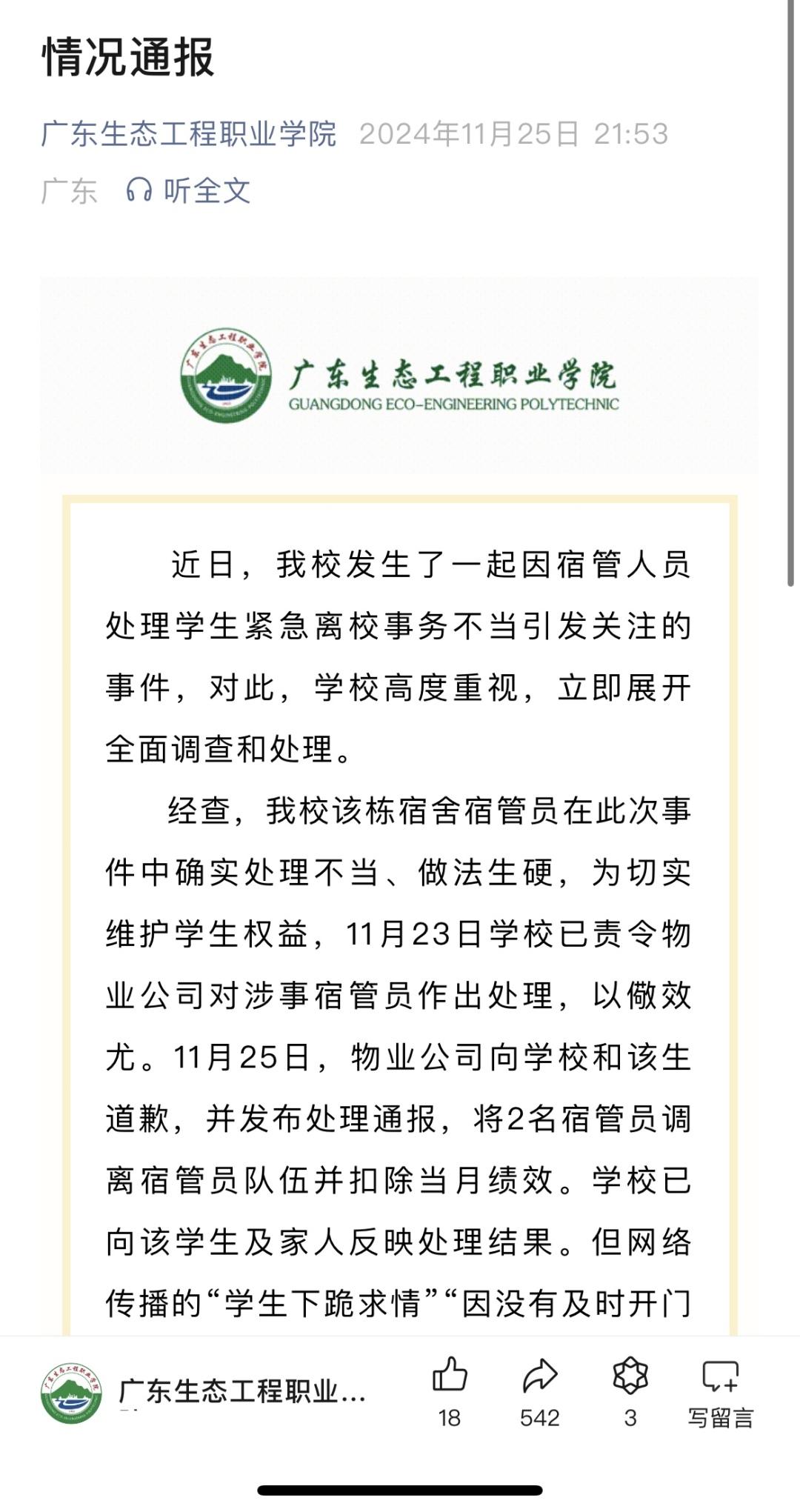 当晚,该校发布情况通报表示:经查,学校该栋宿舍宿管员在此次事件中确实处理不当、做法生硬,为切实维护学生权益,11月23日学校已责令物业公司对涉事宿管员作出处理,以儆效尤。11月25日,物业公司向学校和该生道歉,并发布处理通报,将2名宿管员调离宿管员队伍并扣除当月绩效。学校已向该学生及家人反映处理结果。但网络传播的“学生下跪求情”“因没有及时开门导致没能见上亲人最后一面”与事实不符。