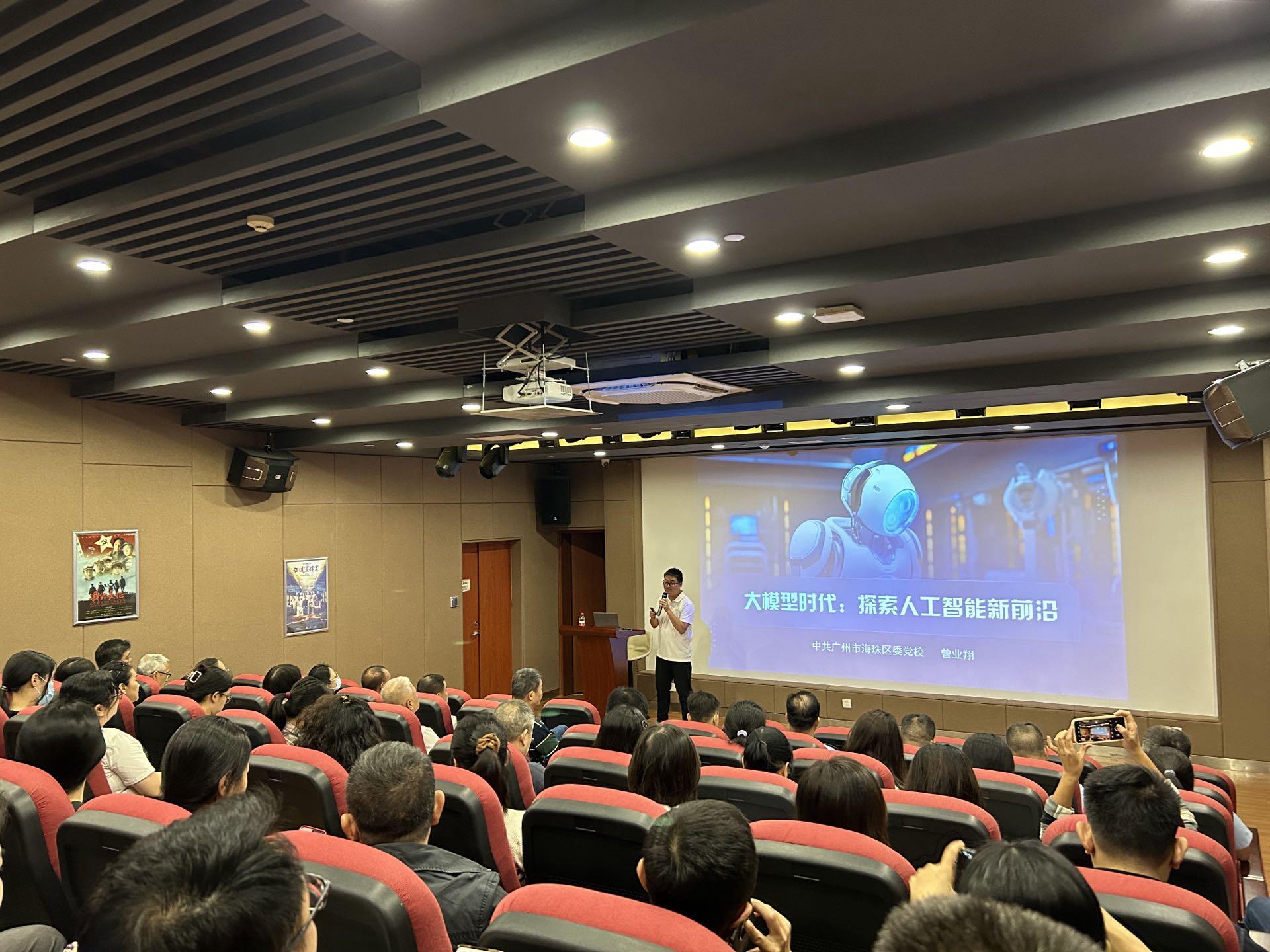 本次培训班,还邀请了中共海珠区委党校老师曾业翔进行授课。他围绕《大模型时代:探索人工智能新前沿》及《发展数字经济,抢占未来发展制高点》作专题宣讲,以生动形象的语言,旁征博引、深入浅出,带领党员干部更全面认识发展人工智能及数字经济的意义,以及人工智能的应用、培育数字人才等重要性、必要性、紧迫性。课后,党员干部纷纷表示,本次培训班此次培训内容详实、紧贴实际、受益匪浅,加深了大家对数字经济的认识,有效激发了大家在数字经济应用方面的创新思维。
