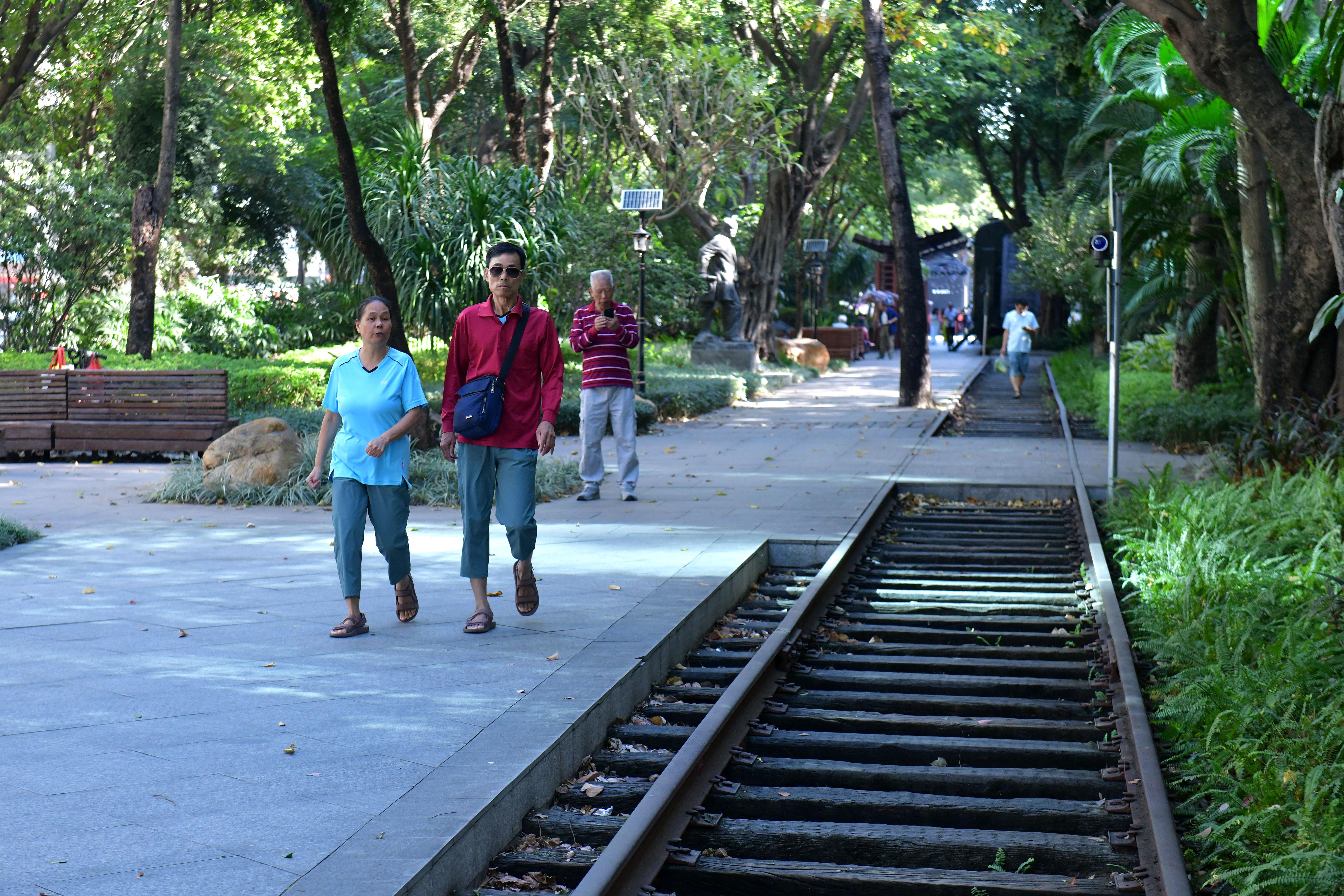 在广州市越秀区大沙头二马路旁,高楼林立、绿树掩映之间,一块印刻有七个墨绿色大字的灰色大石格外引人注目,仔细一看,上面写着“广九铁路纪念园”,走进园中,铁轨枕木与绿皮火车静默于此,浓郁的复古怀旧之感扑面而来。