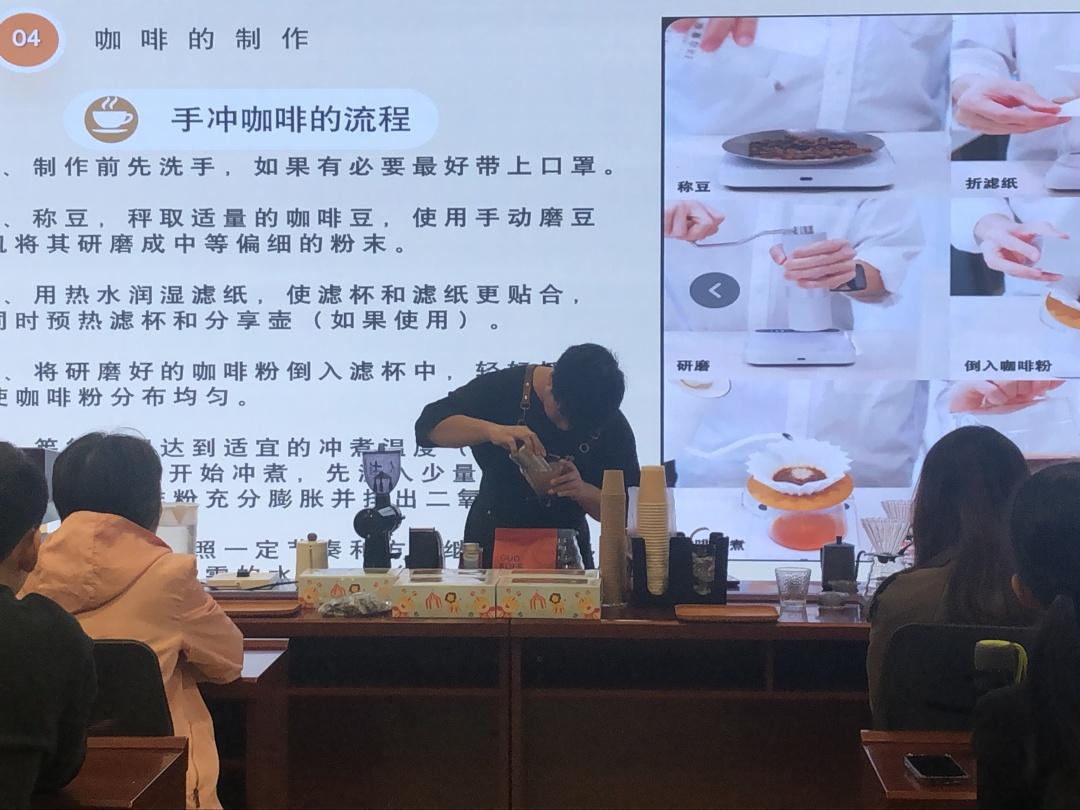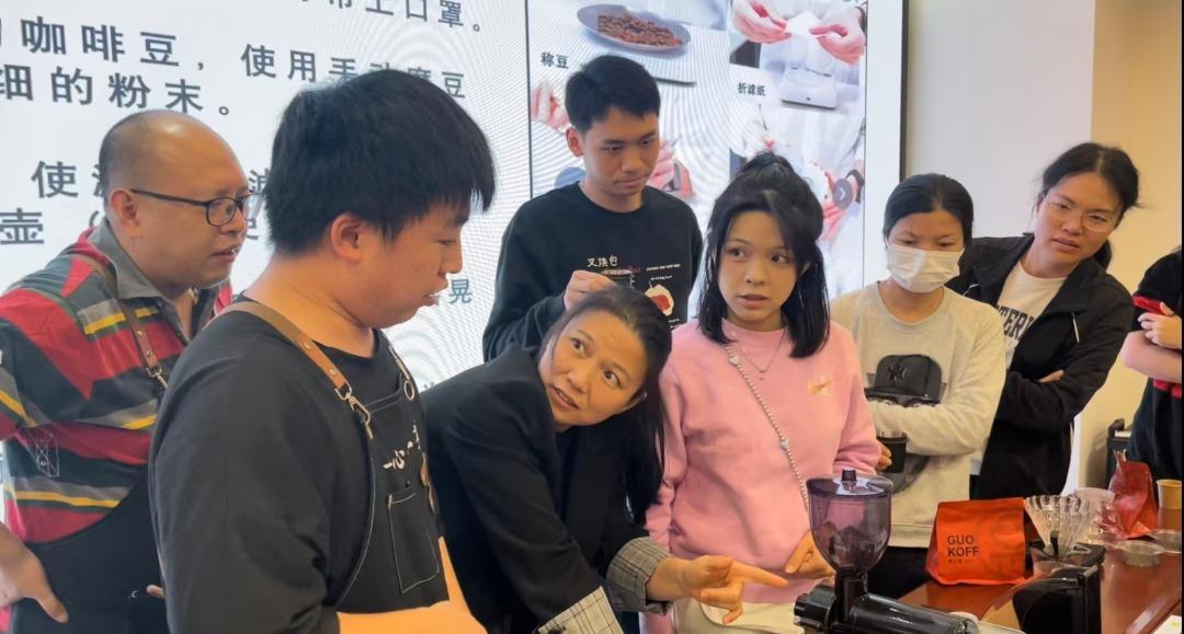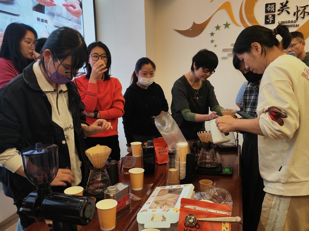 在老师的带领下,学员们学习咖啡的冲泡、品鉴技巧,认识冲泡咖啡设备、相关器具的操作流程、注意事项、技巧等内容。培训课程还设置实训实操环节,每一位学员都尝试冲调一壶手冲咖啡,练习时遇到不明白的地方可及时请教老师,老师也根据学员的实际情况进行指导。