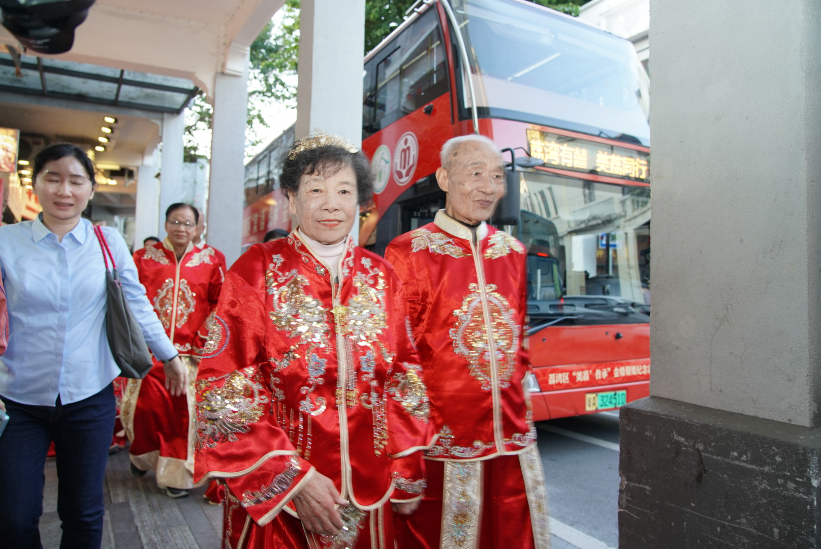 活动中,8对身穿中式婚服的“银发夫妻”在家人、现场嘉宾的见证下,手牵手缓缓登上“美‘荔’婚车,踏上荔湾区“甜蜜路线”婚车巡游之旅。巡游途经荔湾湖公园、仁威庙、荔枝湾、永庆坊等荔湾特色景点,金婚银婚夫妇们动容地看着每一处承载着夫妻美好回忆的沿途风景,那是他们有关爱情的故事、有关荔湾的故事。婚车上精心准备了“一盅两件”“一盅”指的是一壶茶,“两件”则是指两笼点心。“一盅两件”慢慢“叹”,是广府几百年来特有的“茶楼文化”。盖子一打开,还是那几味合口味的点心:秘制黑叉烧、虾饺、糯米鸡、广式蛋挞……在双层婚车巴士上,品味着熟悉的味道,身旁是谈天说地的老伴,这就是“老广”最温馨的时刻。粤剧艺术博物馆是巡游的终点站,工作人员带领夫妇们进入拍摄现场,耐心地教夫妇们如何摆姿势。镜头下的老年夫妇,在摄影中重温情感经历,脸上都洋溢着满满的幸福。拍照间隙交流中,不少老夫妻表示:“当年我们结婚都没有穿过这样的衣服,照片还是黑白的,没想到现在真的有这么好的机会弥补我们的遗憾,我们非常感谢新时代带给我们的幸福。”