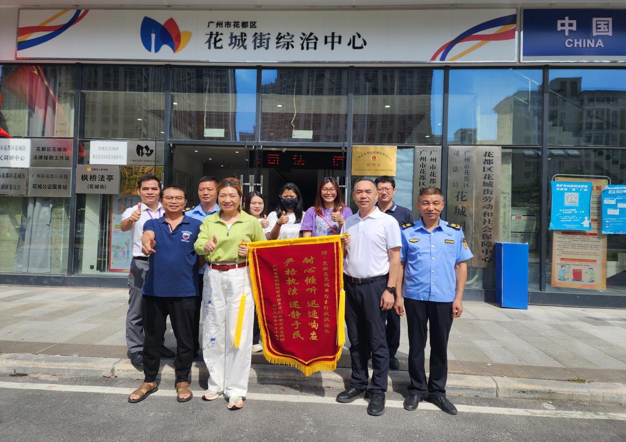 业主代表、物业向花城街综合行政执法队送上锦旗。街道供图