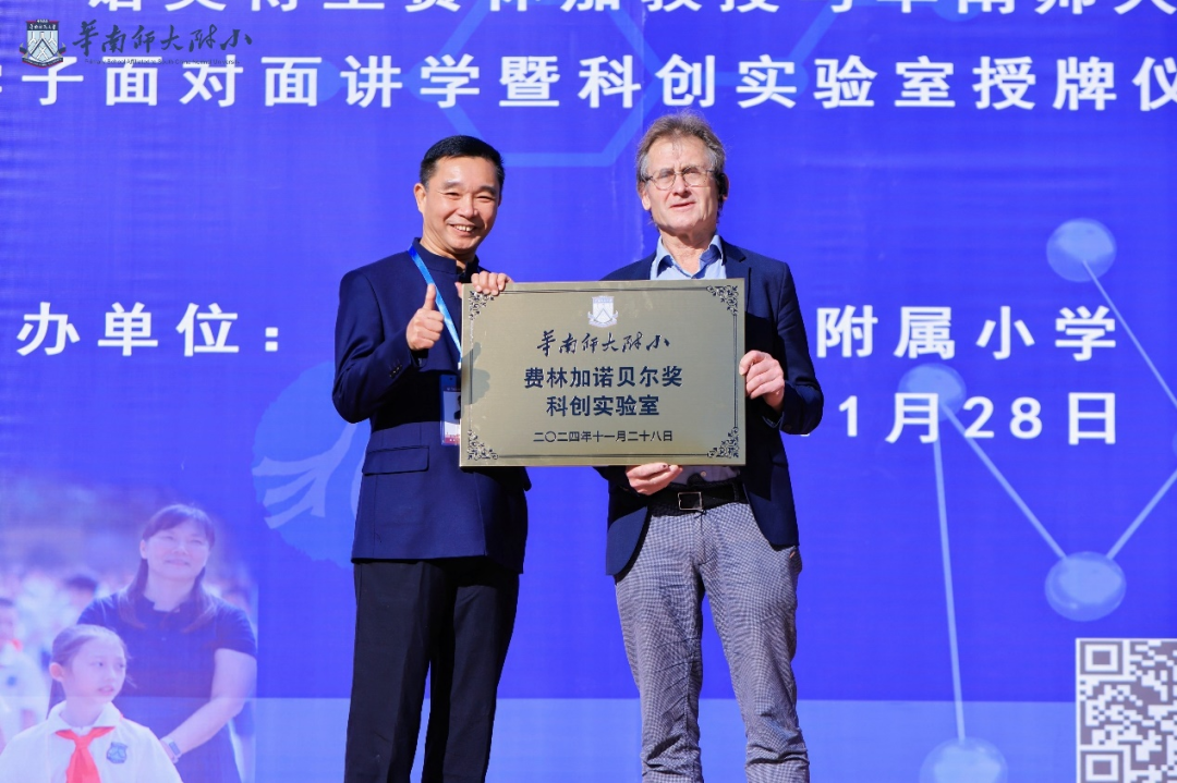 11月28日,华师附小邀请诺贝尔化学奖得主伯纳德·费林加教授来校开展面对面讲学,活动仪式上还举行了华南师范大学附属小学费林加诺贝尔奖科创实验室授牌仪式。
