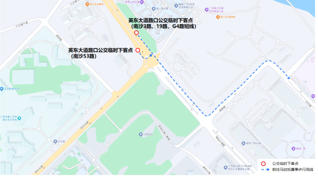 为节省您的时间和避免不必要的绕路,请参赛选手从【南沙客运港站】E、F、G出口前往存包区、安检区和集结区。