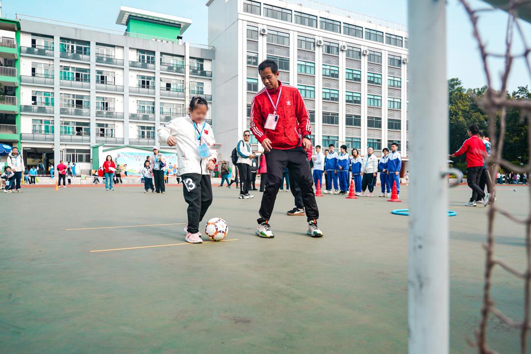 足球直线运球射门项目中,不少学生也需要老师一直在身边指导,才能按照指定的路线,将球顺利踢出。考虑到特殊教育需要学生的运动能力,融合运动会设置了不同类型的项目,包括50/100米跑、立定跳远、沙包掷远、足球直线运球射门、运球绕过障碍物射门、“两人三足”等,项目难度较普通运动会有所降低,各个项目旁都有老师指引。