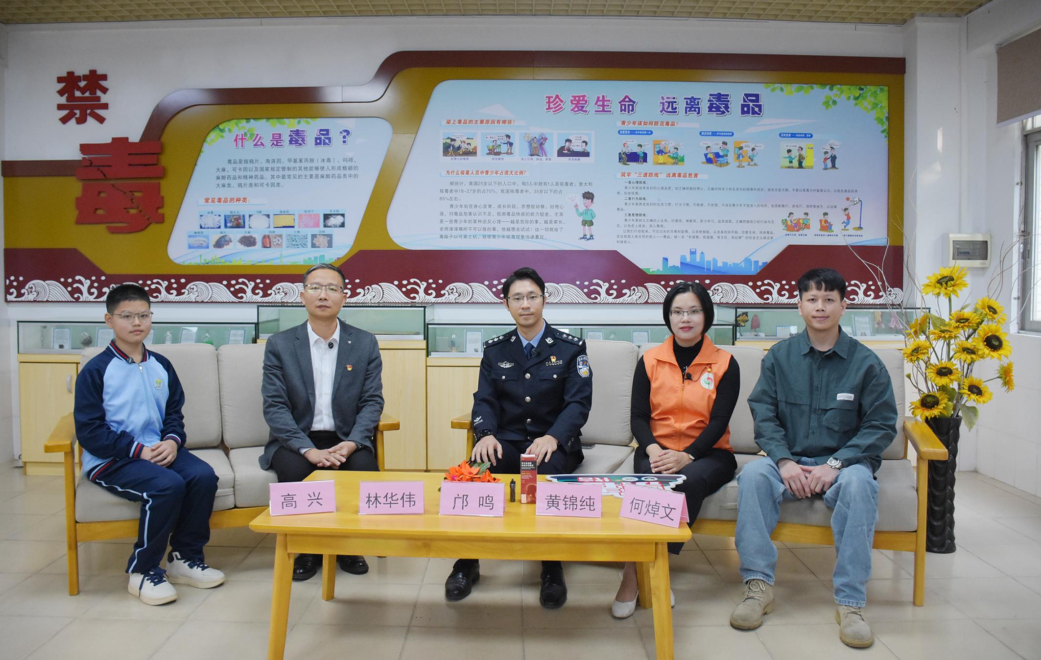 本期节目来到大石街学校中首个禁毒专题宣教课室——大石中学毒品预防宣教室进行录制,还邀请多位一线禁毒工作者走进节目间:大石中学副校长林华伟,番禺区公安分局禁毒大队二级警长、番禺区禁毒讲师团成员邝鸣,大石街禁毒专干何焯文,大同社工机构助理总干事、番禺北片禁毒社工项目主任黄锦纯;大石中学初一4班班长高兴主持本期节目。