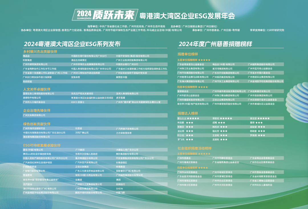 12月20日,由广州日报报业集团(广州日报社)主办的2024质跃未来·粤港澳大湾区企业ESG发展年会在广报中心隆重举办,来自大湾区多家行业标杆企业、机构共聚一堂,共话ESG高质量发展之道。