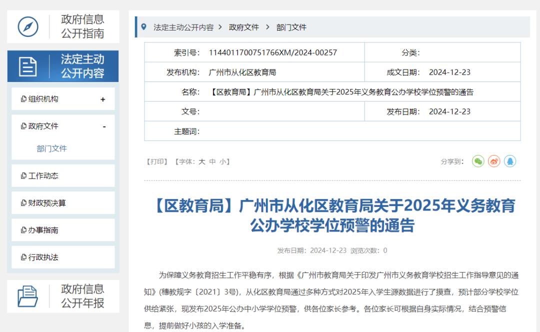 12月23日,广州市从化区教育局发布了《关于2025年义务教育公办学校学位预警的通告》(下称“《通告1》”)。