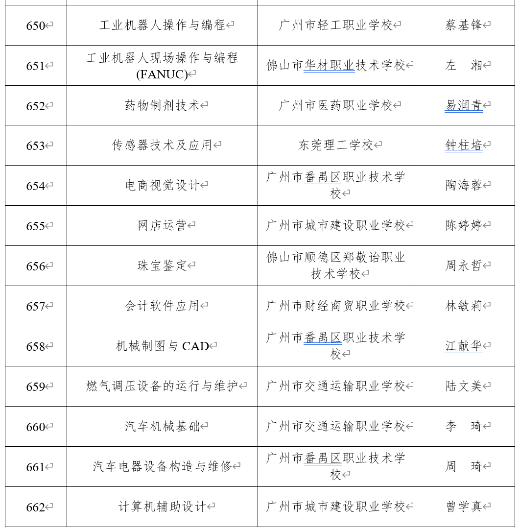其中,广东的中职学校共15门课程入选,广州市番禺区职业技术学校有3门入选,位居同类学校第一,广州市交通运输职业学校、广州市城市建设职业学校、广州市轻工职业学校各有2门入选,广州市财经商贸职业学校、广州市医药职业学校、东莞理工学校、佛山市顺德区郑敬诒职业技术学校、佛山市华材职业技术学校、清远工贸职业技术学校等各有1门入选。