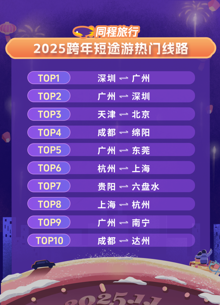 1天的周中休假里,仍有不少游客希望换个城市,换一种心情来迎接新年。大湾区、长三角和京津冀等各大城市群内的短途出行最为热门。广州和深圳,北京和天津,杭州和上海的游客开启“双向奔赴”,成都、贵阳等省会城市也有不少游客选择乘高铁前往周边城市过新年。元旦假期期间,同程旅行也推出了9元火车票盲盒、订火车票享接送站前5公里免费等活动,方便游客假期出行。
