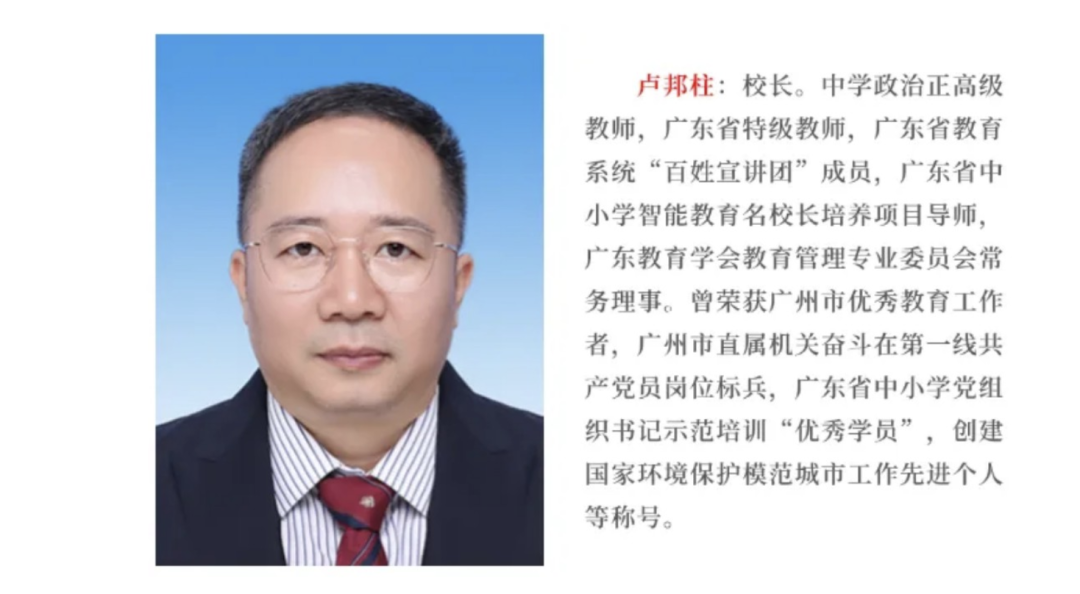该校官网信息显示,卢邦柱,中学政治正高级教师,广东省特级教师,广东省教育系统“百姓宣讲团”成员,广东省中小学智能教育名校长培养项目导师,广东教育学会教育管理专业委员会常务理事。曾荣获广州市优秀教育工作者,广州市直属机关奋斗在第一线共产党员岗位标兵,广东省中小学党组织书记示范培训“优秀学员”,创建国家环境保护模范城市工作先进个人等称号。