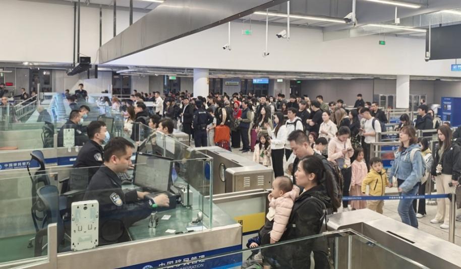 皇岗边检站民警高效快捷为出国旅游内地居民办理查验手续。