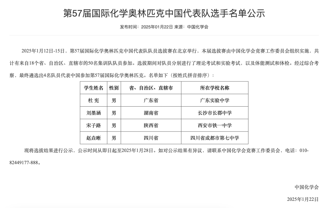 通知显示,2025年1月12日至15日,第57届国际化学奥林匹克中国代表队队员选拔赛在北京举行,本届选拔赛由中国化学会竞赛工作委员会组织实施,共计有来自18个省、自治区、直辖市的50名集训队队员参加。选拔期间,队员分别进行了理论考试和实验考试,以及体能测试和体检。