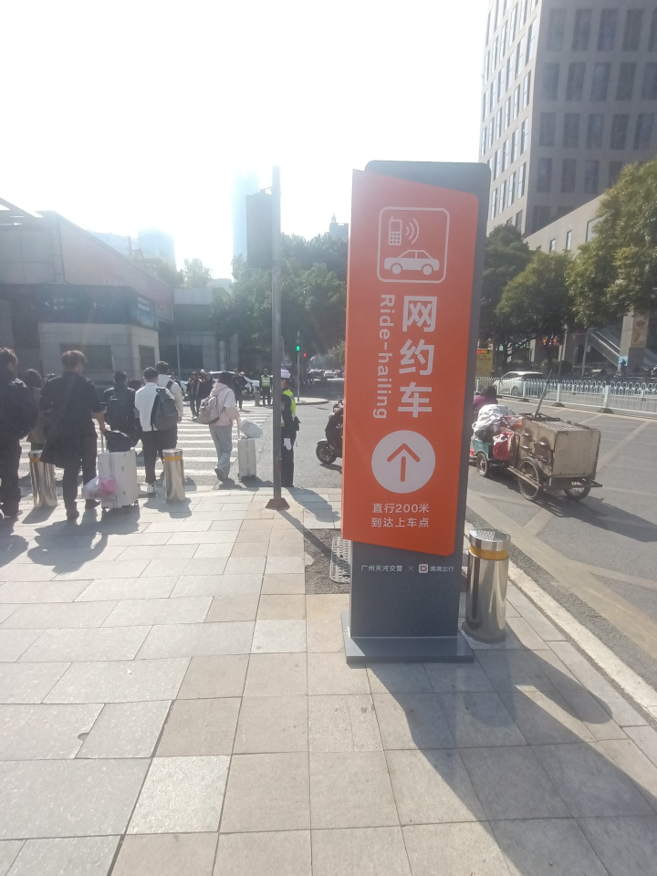 广州东站设有1个网约车上客点,位于天河飘绢瀑布广场前路段。具体指引路线如下:出站后,沿出站口直行约50米到达出租车上客通道前方斑马线(图24),穿过斑马线直行约200米,然后左转直行约50米,中途分别有三个网约车上客点指引标志(图25),到达天河飘绢瀑布广场网约车上客点(图26)。