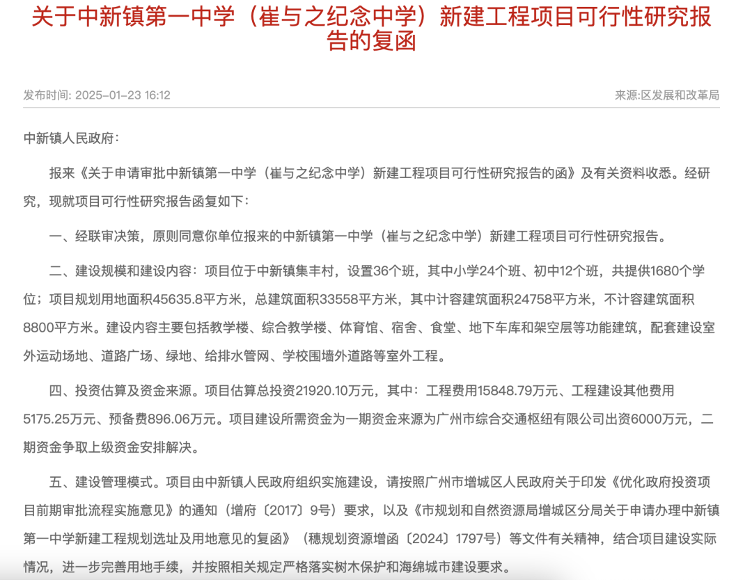 1月23日,增城区人民政府网发布了《关于中新镇第一中学(崔与之纪念中学)新建工程项目可行性研究报告的复函》(以下简称《复函》)。《复函》显示,增城区将新建一所九年一贯制学校,设小学24个班、初中12个班,共提供1680个学位。