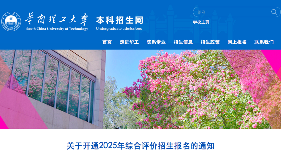 华南理工大学本科招生网日前发布消息称,该校已于1月21日10:00开通综合评价招生报名系统(网址:https://bm.chsi.com.cn/)。2025年,华工将在广东、江苏、山东、上海、浙江等五省市继续实施综合评价招生。