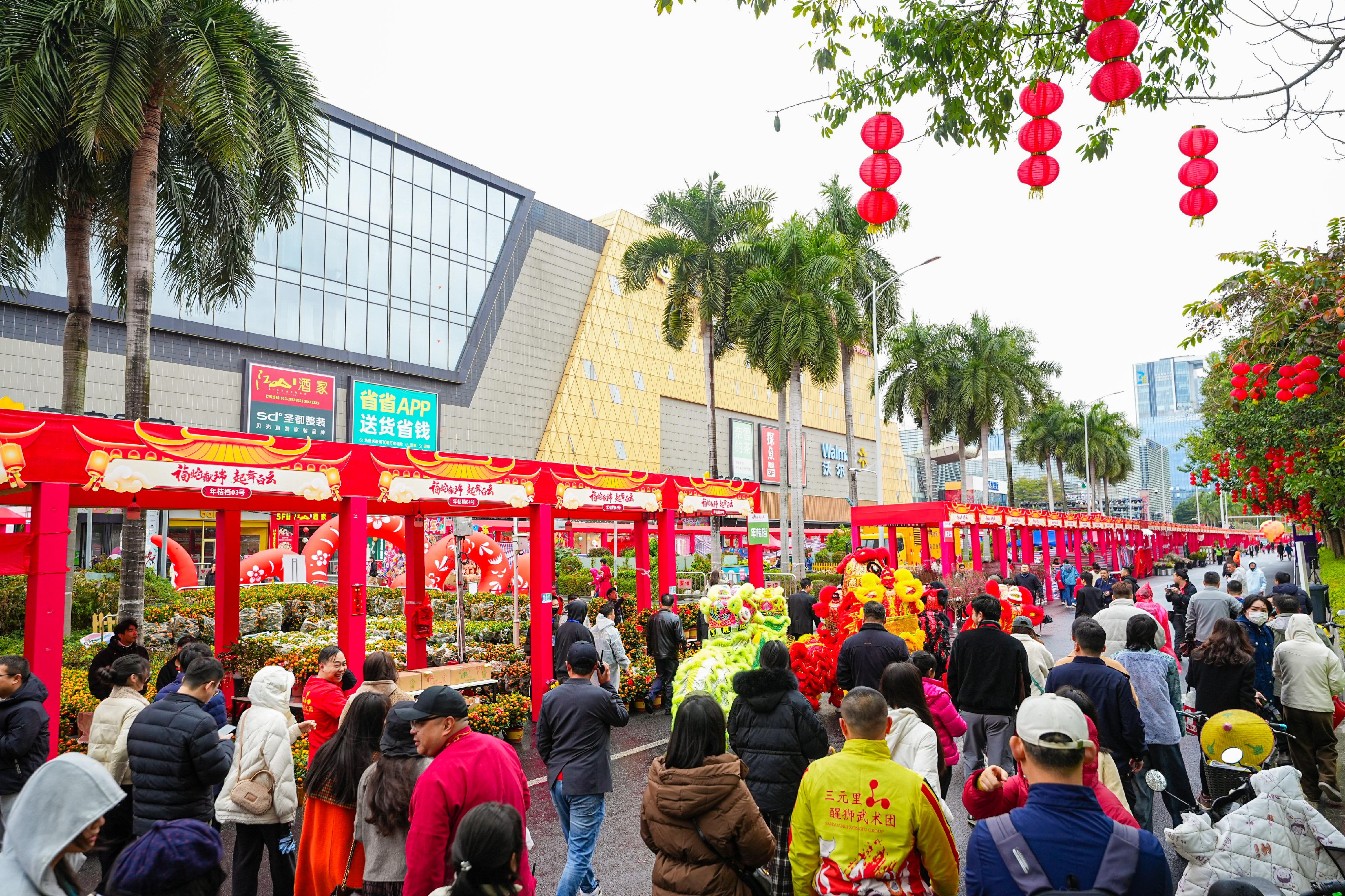 上午10时,来自白云区本地的三元里醒狮武术团在主牌楼下带来精彩的舞狮表演,现场锣鼓喧天、人声鼎沸,一开场便舞出浓浓“年味”,在一片热火朝天中宣告白云传统迎春花市正式开市。