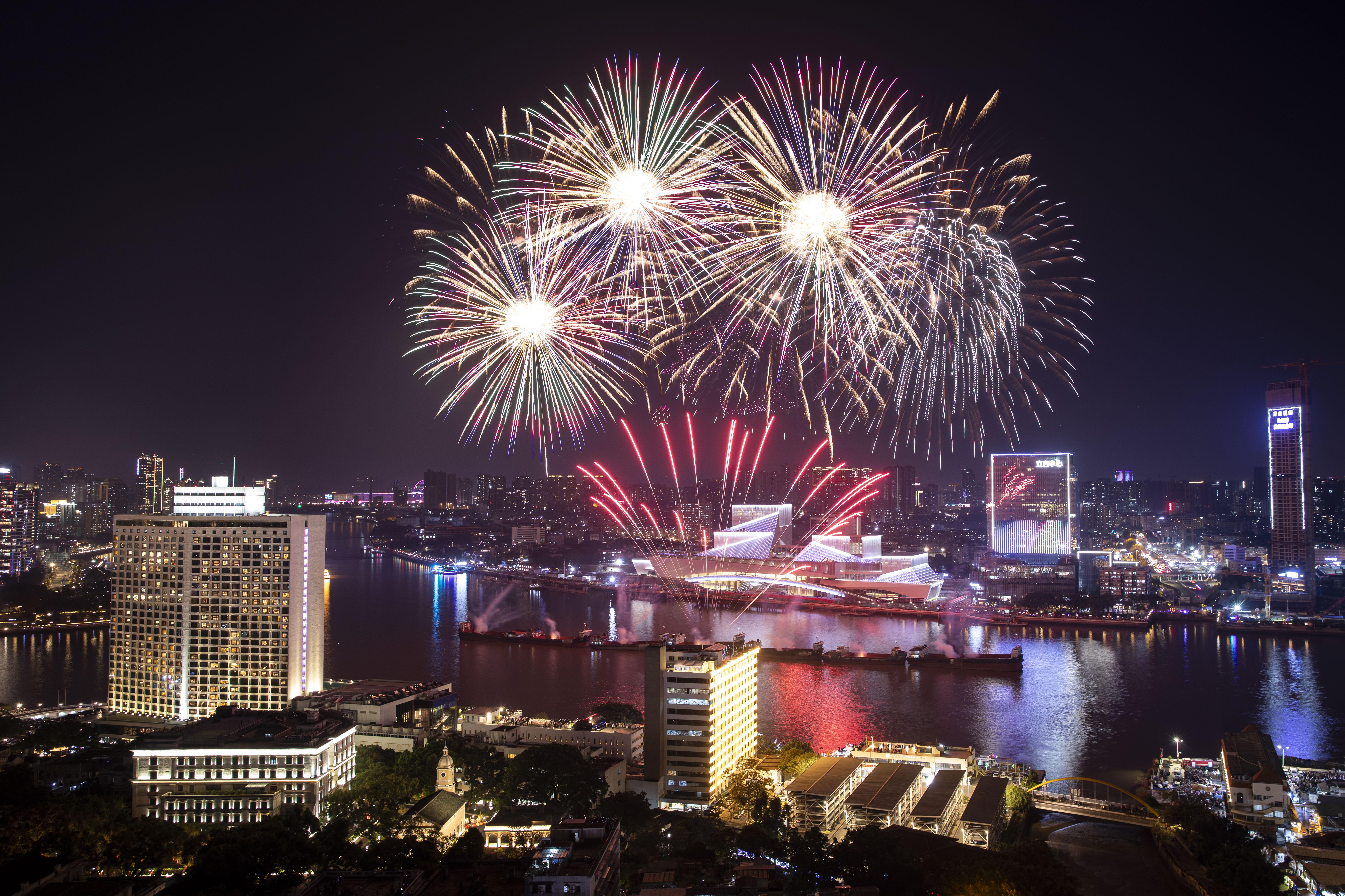 白鹅潭烟花汇演:大年初一璀璨绽放,持续45分钟的国际化烟花表演场面震撼夺目。详情>>