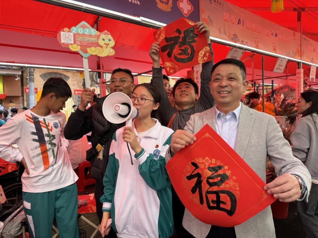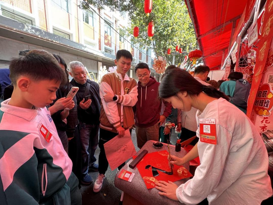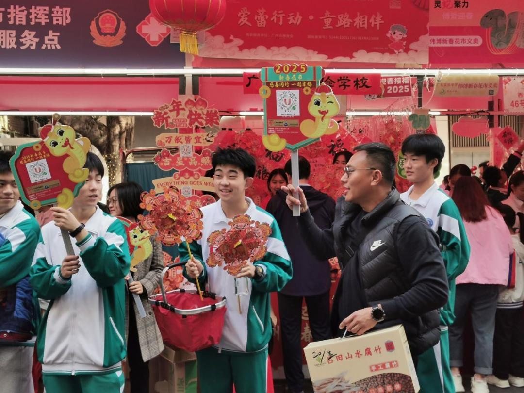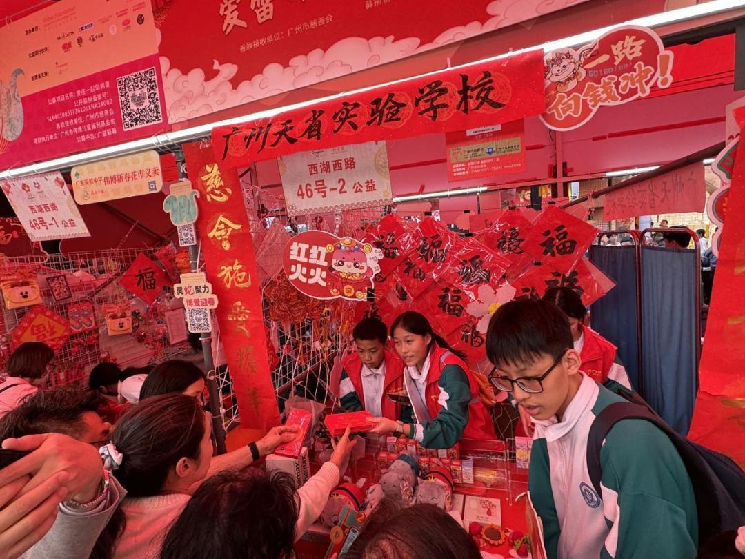 1月25日至26日,广州天省实验学校师生与家长在越秀区迎春花市的档口“营业”,各展所能,开档进行爱心义卖。参与了校内书法校本课程的同学们现场泼墨写春联,用传统文化传递心意;多才多艺的学生演奏乐器,吸引众多市民驻足欣赏;家长们慷慨解囊,捐赠全新物品,用实际行动支持公益;更有祖孙三代一同上阵,在摊位前卖力叫卖,满是温馨。
