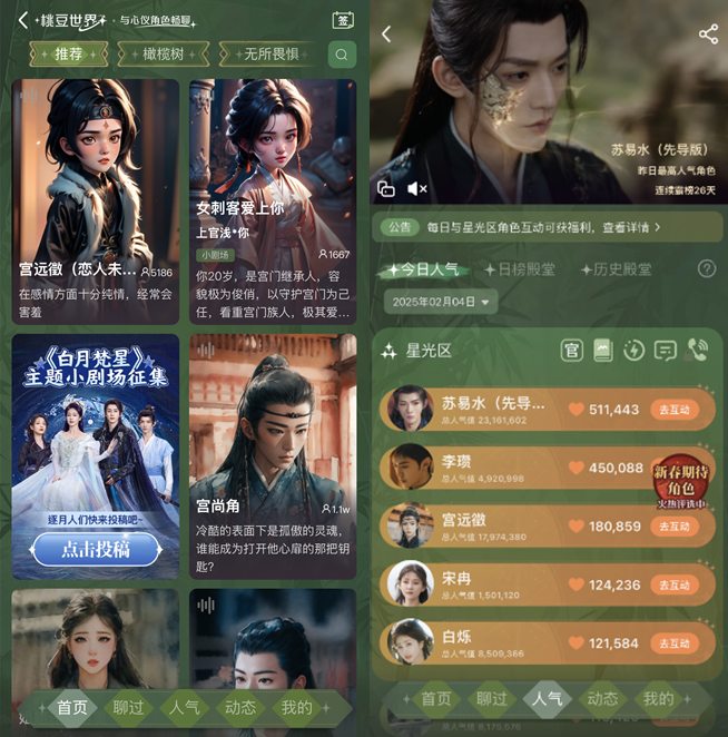 “无弹幕,不观影。”只有弹幕,那还不够。如今在AI的加持下,粉丝可以与喜爱的剧中角色对话,和《白色橄榄树》里的李瓒聊天,打卡《白月梵星》中的白烁、梵樾的朋友圈都不是梦……春节假期,爱奇艺桃豆世界用户访问人数较节前增长21.7%,同比上月增长60%。