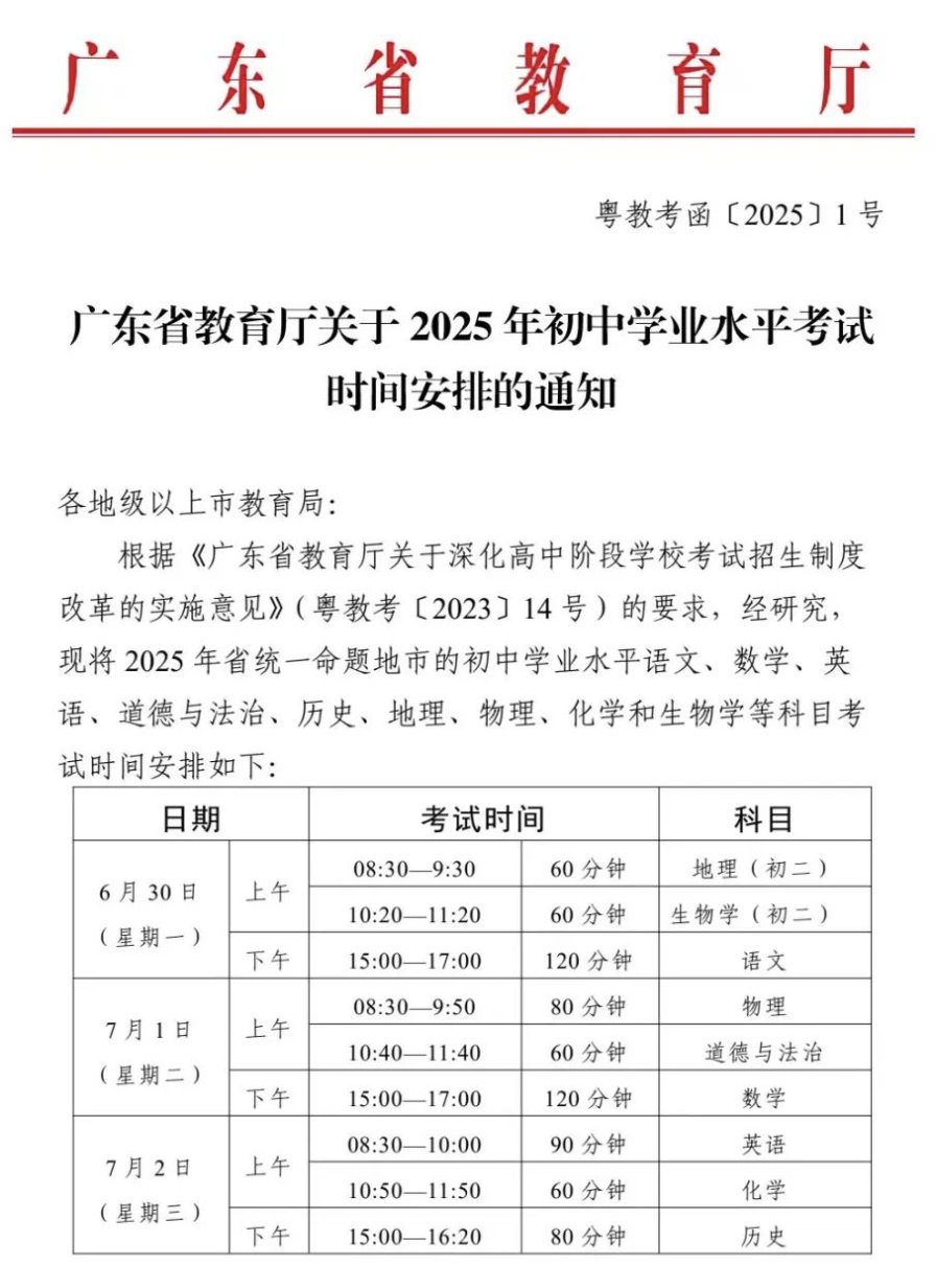 2月6日,珠海市教育局在官方公众号发布信息称,近日,广东省教育厅印发关于2025年初中学业水平考试时间安排的通知。通知显示,2025年广东省初中学业水平考试将于6月30日至7月2日进行。