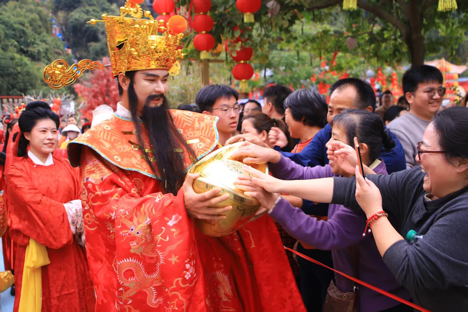 据介绍,为迎接广大市民游客的到来,从景区入口至山顶,一路上大红灯笼、吉祥蛇宝、趣味许愿互动等系列打卡点,装点满园,喜气洋洋,年味十足。春节期间,观音山上更是精彩不断,民俗展演、灵蛇献瑞、五福贺新春等系列传统年味互动活动有序开展,其中以福、禄、寿、喜、财五福中的财神展演互动,摸金元宝、摸聚宝盆、派发财运值、送白菜(寓意“百菜”)等,尤为受追捧,吸引众多游客观赏、参与。