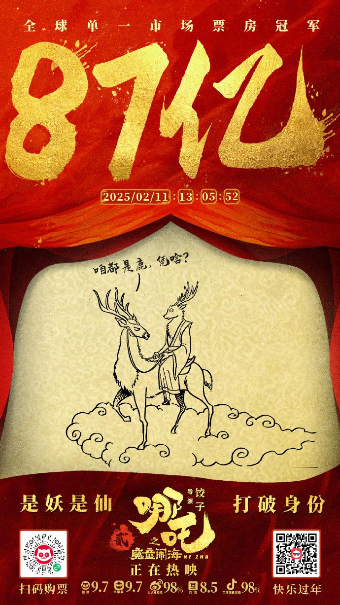 2月11日13时许,电影《哪吒之魔童闹海》票房突破87亿元。