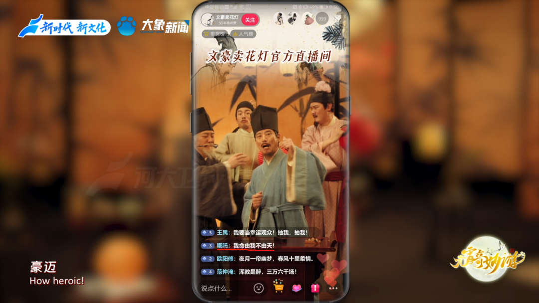 在“大宋购官方直播间”里,苏轼更是化身带货主播,卖起了红红火火的大宋灯笼。柳永、范仲淹纷纷刷起“嘉年华”,连哪吒都到直播间里来打榜,大喊“我命由我不由天”。极富创意的设计,让网友看后纷纷献上膝盖:“又突破次元壁了!”“哪吒都来了,果然是国风顶流的相会!”