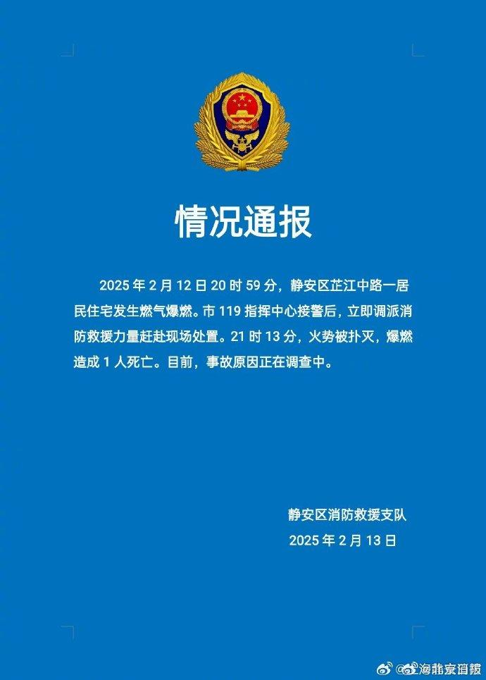 2月13日零点23分,上海静安区消防救援支队发布通报:2025年2月12日20时59分,静安区芷江中路一居民住宅发生燃气爆燃。市119指挥中心接警后,立即调派消防救援力量赶赴现场处置。21时13分,火势被扑灭,爆燃造成1人死亡。目前,事故原因正在调查中。