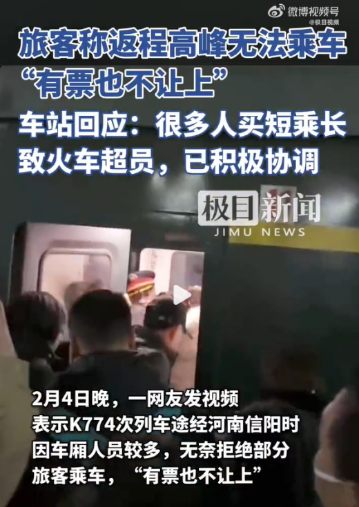 2月4日大年初七,各地迎来返程高峰。4日晚,河南一网友发视频称,K774次列车途经河南信阳站时,因车厢人员较多,无奈拒绝部分旅客乘车,“有票也不让上”。2月5日,该车站工作人员回应称,确有此事,因为车内有很多人“买短乘长”,到原票站点不下车,导致车内人越来越多。有部分旅客因超员无法上车,车站已积极协调处理。