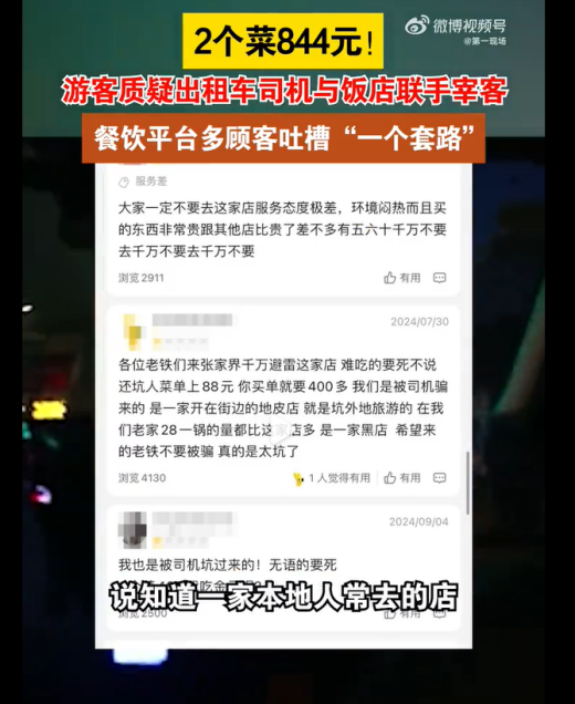 2月3日,有网友报料称在张家界旅游时,疑遭遇出租车司机和饭店联手宰客。陈女士称,当时打车被出租车司机推荐到一家叫“土家园”的饭店,服务员推荐招牌菜娃娃鱼和打鼓皮,还说两个菜就够吃了。后面她看饭店评价不好,出去一问鱼258元一斤,结账时发现两个菜居然要844元!相关餐饮平台也有多名顾客吐槽有类似经历。2月6日下午,官方通报称,涉事餐饮店“土家园”存在支付出租车司机回扣招揽客人等宰客行为,已责令涉事经营主体停业并对其进行立案调查。
