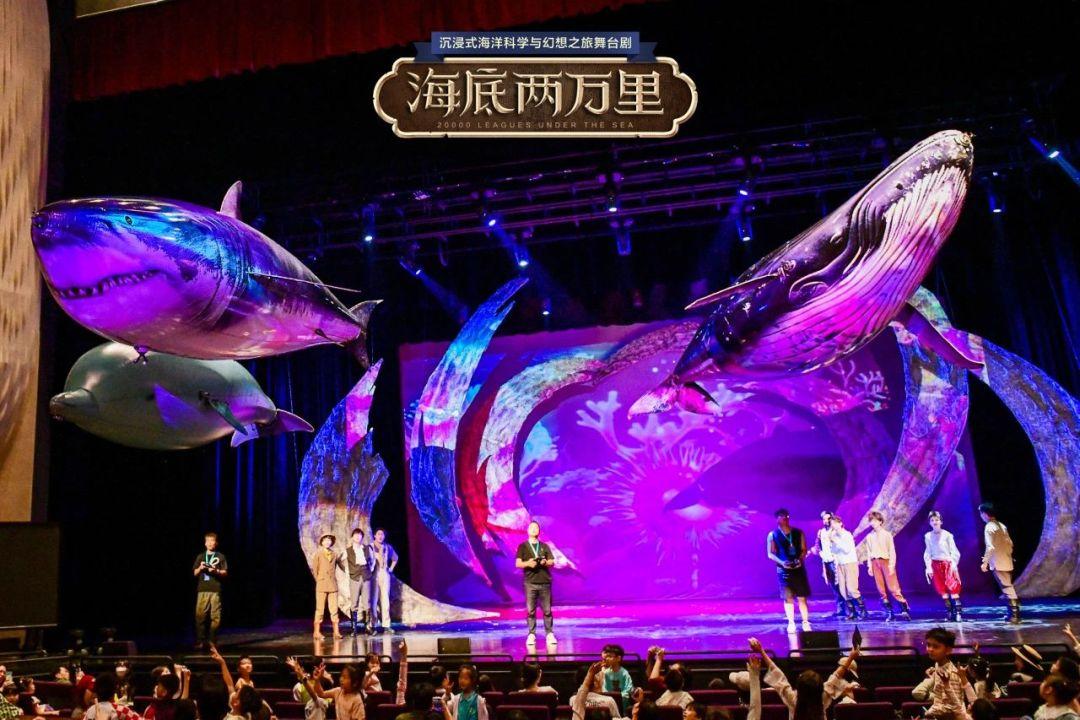 演出现场,剧场变身为巨大的“海底世界”,舞台延伸至观众席上空,大型海洋生物近在咫尺,颠覆室内剧场观剧体验!