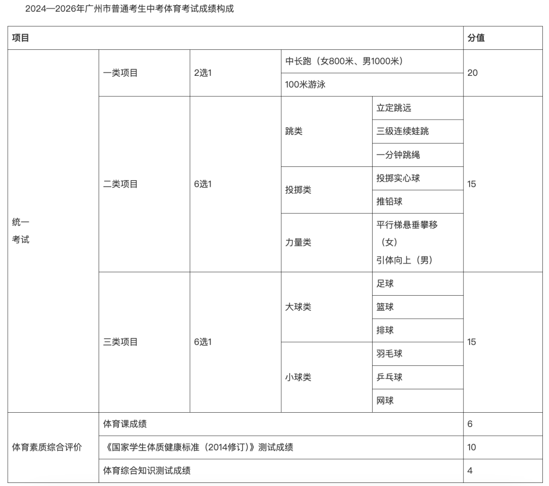 2024—2026年体育考试具体实施意见、统一考试项目考试规则、评分标准和特殊考生医务审核指南可在广州市教育局官网或广州招考网查阅。