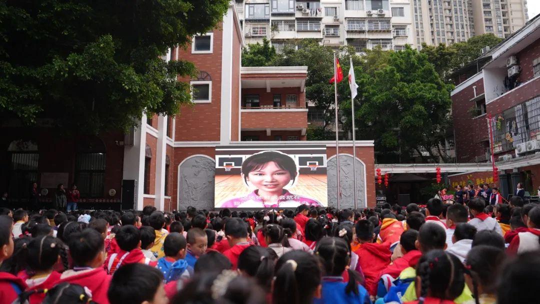 在开学思政第一课上,学校党总支书记韩萍别出心裁地以AI形象为孩子们讲解了开学典礼题目的含义:“与阳光一起YUE动”——“YUE”有跳跃、超越、飞越、愉悦、喜粤之意,希望阳光少年在跃动中,感受魅力广州,一眼心动中国,以小主人翁的姿态迎接第十五届全运会。所以当韩书记通过AI技术化身不同形象出现在舞台屏幕时,孩子们都沸腾了。该校校长汤婉峰告诉记者,为了让孩子们进一步了解、接触、拥抱人工智能,学校团队在开学前特别设计了主讲人的AI形象,“希望以这样的形式,让学子们更喜欢听,更喜欢看。”