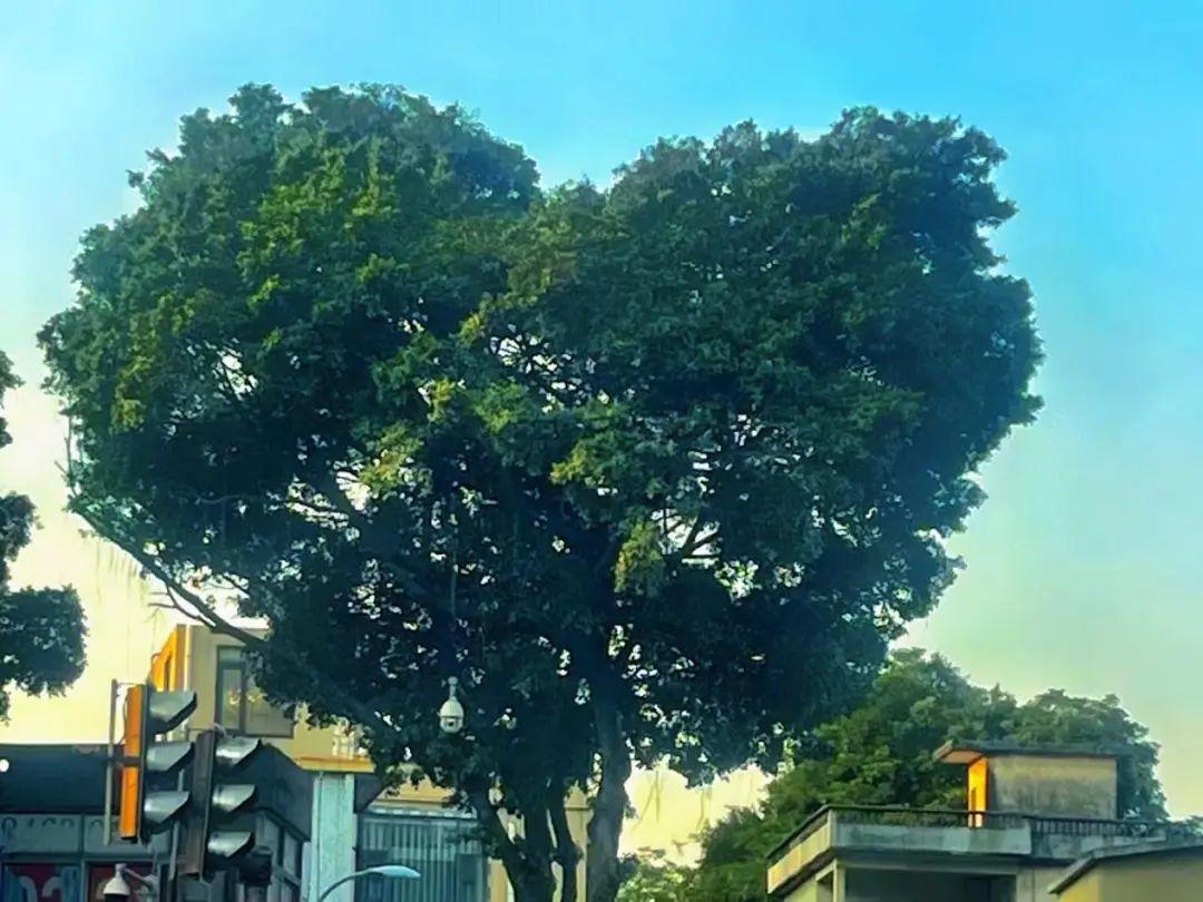 据悉这棵“爱心树”高约13米,胸径达到45公分,长势挺拔,树冠茂密,枝叶葱绿,根系完整。它在车水马龙、人潮涌动的街头静静矗立,宛如一颗璀璨的明珠,闪耀在喧嚣之中,吸引着过往行人的目光。
