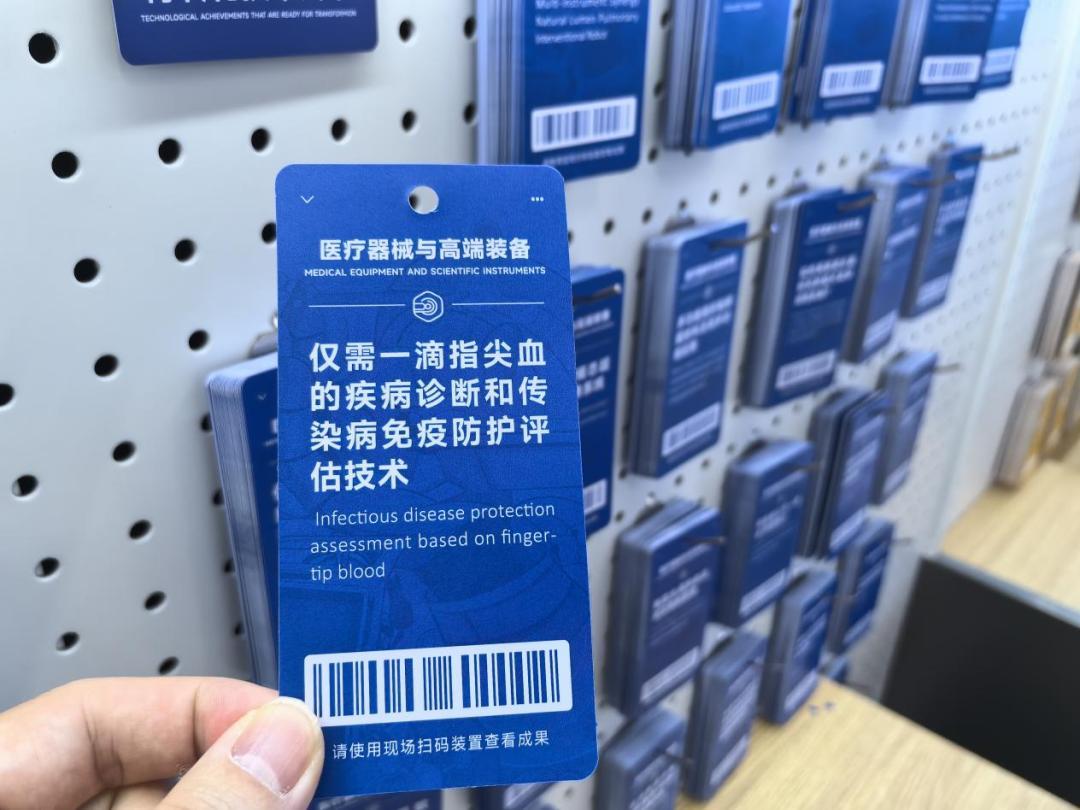 超市的最大特点就是快捷方便,“成果超市”也是如此。顾客只需要拿起卡片扫一扫,就可以获悉该项成果的技术创新点、应用场景、产业合作及完成人信息等内容。另外,通过超市内的感应装置扫描卡片上条形码,这些内容也能立刻在大屏幕上呈现。