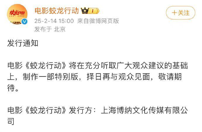 刚刚,电影《蛟龙行动》宣布将制作特别版,择日再与观众见面。