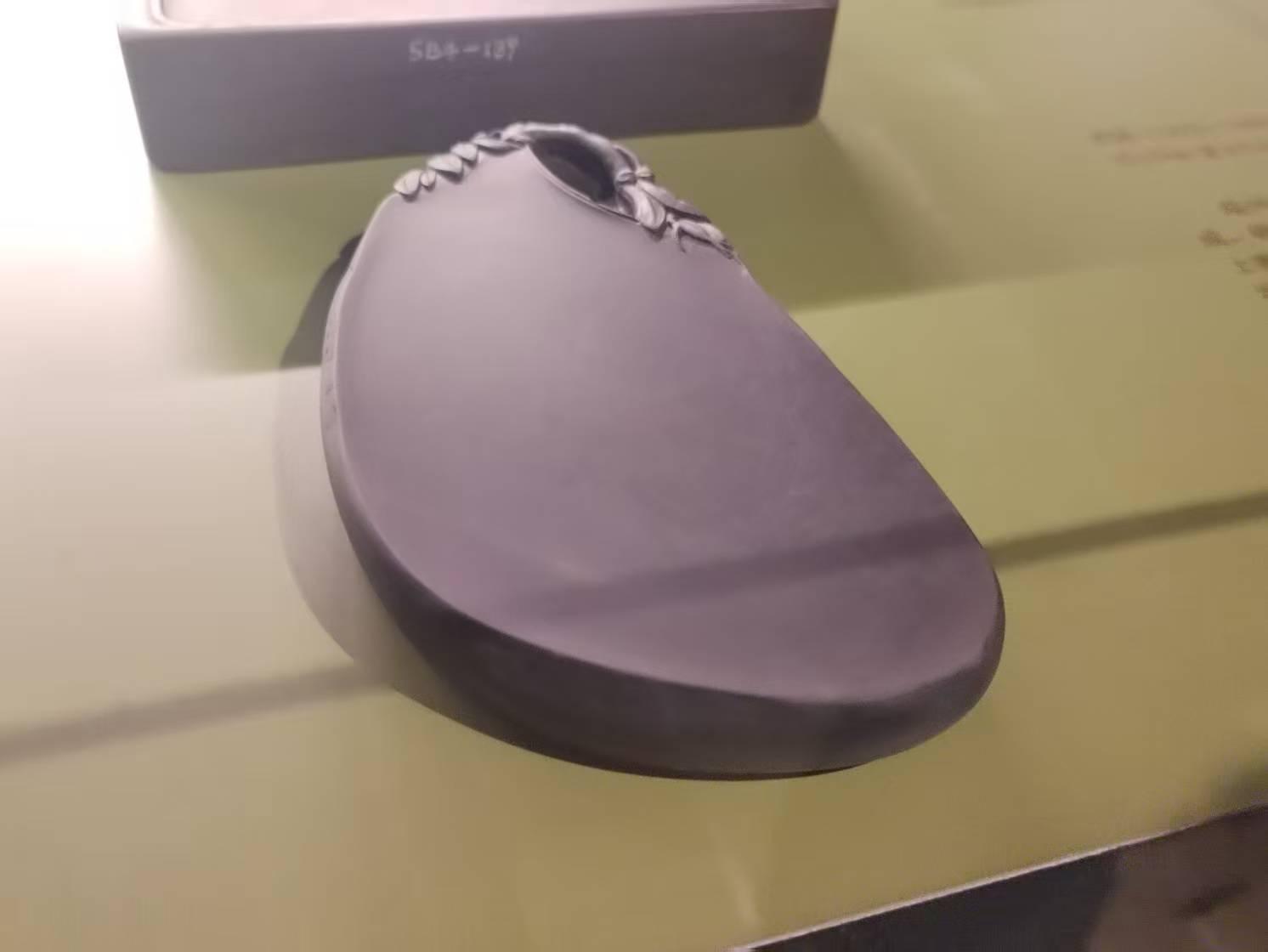 展览中的蝉形砚年代约在宋元之间,砚体仿蝉造型,砚额正中有一石眼,绕石眼深雕出蝉的大眼作砚池,下端修长蝉身为砚堂。头部往下边线曲折有致,是为蝉翼。砚背弧形,首部枕式落地,下方对称出乳足,利于稳立。砚式文雅从容,线条浑圆饱满。古人认为蝉居枝头,只吸干净露水,不食人间烟火,其所喻之人品,自属于高洁之象征,因而传统文人常常借蝉自喻。