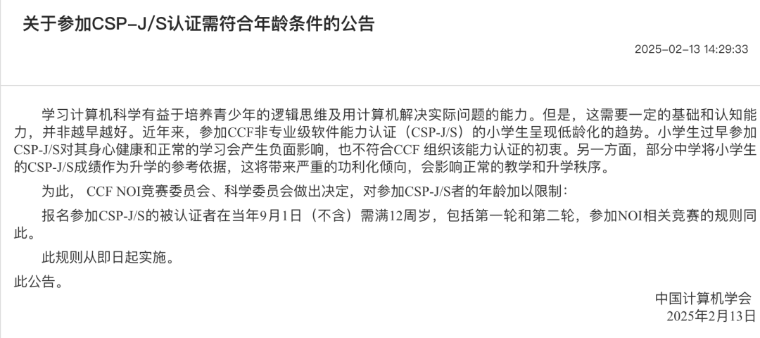 该公告写道:学习计算机科学有益于培养青少年的逻辑思维及用计算机解决实际问题的能力。但是,这需要一定的基础和认知能力,并非越早越好。近年来,参加CCF非专业级软件能力认证(CSP-J/S)的小学生呈现低龄化的趋势。小学生过早参加CSP-J/S对其身心健康和正常的学习会产生负面影响,也不符合CCF 组织该能力认证的初衷。另一方面,部分中学将小学生的CSP-J/S成绩作为升学的参考依据,这将带来严重的功利化倾向,会影响正常的教学和升学秩序。为此,CCF NOI竞赛委员会、科学委员会做出决定,对参加CSP-J/S者的年龄加以限制:报名参加CSP-J/S的被认证者在当年9月1日(不含)需满12周岁,包括第一轮和第二轮,参加NOI相关竞赛的规则同此。此规则从即日起实施。