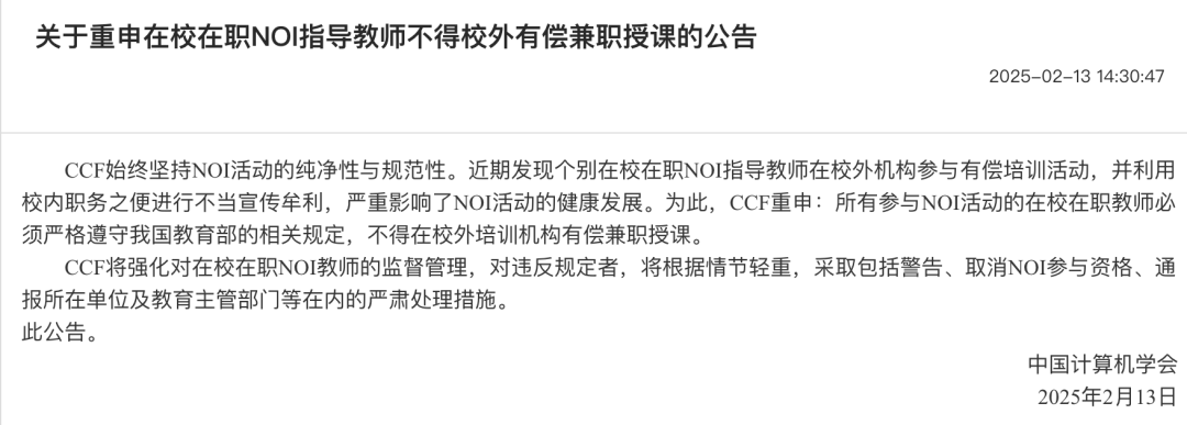 《关于重申在校在职NOI指导教师不得校外有偿兼职授课的公告》写道:近期发现个别在校在职NOI指导教师在校外机构参与有偿培训活动,并利用校内职务之便进行不当宣传牟利,严重影响了NOI活动的健康发展。为此,CCF重申:所有参与NOI活动的在校在职教师必须严格遵守我国教育部的相关规定,不得在校外培训机构有偿兼职授课。